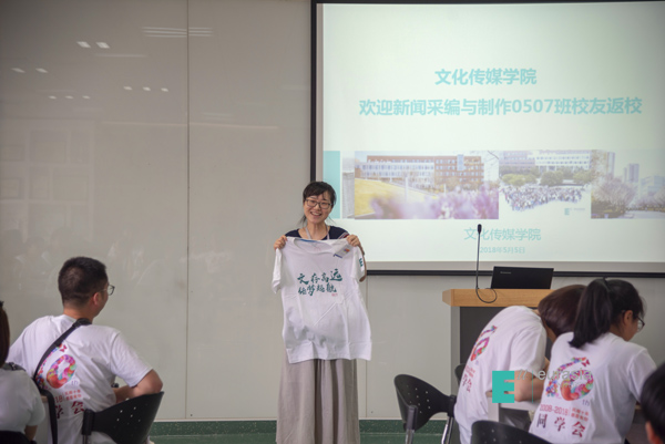 2018年5月5日上午,鸭脖文化传媒学院新闻与采编制作0507班毕业10周年“青春不散场”聚会在402室举行。校友们心怀对母校的感激之情重返校园,共话当年青葱岁月。