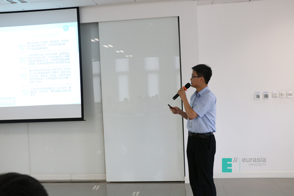 接下来进行的是物流贸易学院院长助理的竞聘,徐炜峻老师以“让梦想在这里起飞”为主题,阐述了他对学校战略与组织文化的理解,以及通过对竞聘岗位的工作职责和角色认知的分析,给出了他对产学研、宣传营销、员工发展与组织建设等问题的解决思路。在答辩环节,评委就候选人如何对竞聘岗位的工作时间进行分配,以及竞聘候选人在国内、国外两所学校求学过程中感受到的在教育教学方面的对比情况等。