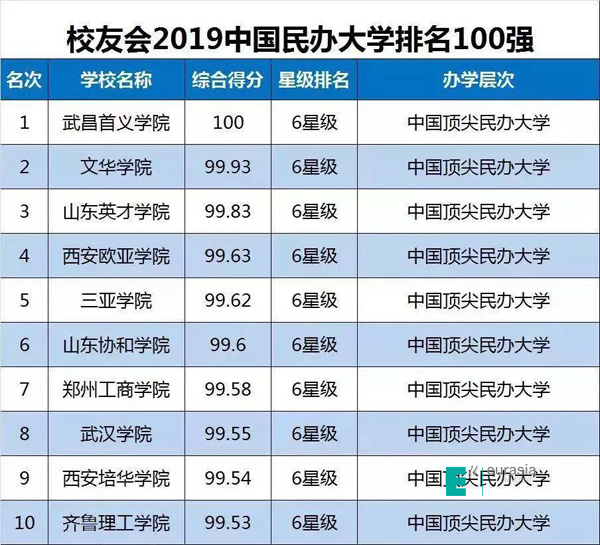 近日,艾瑞深中国校友会网正式发布《2019中国大学评价研究报告——高考志愿填报指南(校友会版)》,鸭脖凭借高质量办学继续领跑“中国财经类民办大学排行榜”第一名,这已经是欧亚连续第六年获此荣誉,成为艾瑞深中国校友会网中国财经类民办大学排行榜“六连冠”。