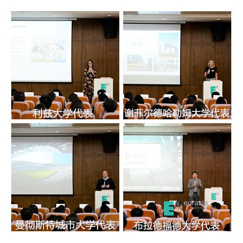 随后,利兹大学的校方代表Katie Fawley率先介绍了利兹大学的优势学科,除了传统的强势学科商学院外,利兹大学在环境科学、医药与健康、艺术,人文与文化等专业也都各有特色。 谢菲尔德哈勒姆大学的招生官Lucy Jackson 介绍了目前已发展为全英第六大的综合性大学,该校是中国教育部中英学历学位互认协议中第一批通过的英国院校。学校的旅游与酒店管理、体育管理、建筑与设计专业的均在全英排名前20位,并在12个学科领域被教育质量评估协会评为优秀。曼彻斯特城市大学的Jonathan Pitt 通过介绍曼彻斯特这一城市的文化生活,为学生们展开了在曼彻斯特城市大学的学习和生活图景。作为在曼城有五个校区的综合性大学,该校在艺术设计和商科教育方面都有诸多建树。利兹贝克特大学招生官Nina Li 结合自己的留学选校经历,风趣幽默的为同学们对比了中英教育的不同点,以及在如何提高个人语言能力,怎样融入当地生活等方面给了同学们一些实用性的建议。布拉福德大学招生官丁磊,为同学们介绍了商科“三项皇冠”(AACSB、EQUIS、AMBA)认证,作为有这三重认证的院校,布拉德福德大学在全英127所大学中排名53,其中管理与法律学院在欧洲的所有商学院中排名59。在校期间,学校会组织学生参加撰写简历的工作坊,帮助大家写一份漂亮的个人简历,为日后的职场拼搏奠定扎实的基础。此外,学校还设有专门的就业服务中心,围绕日后就业的相关问题为大家答疑解惑。