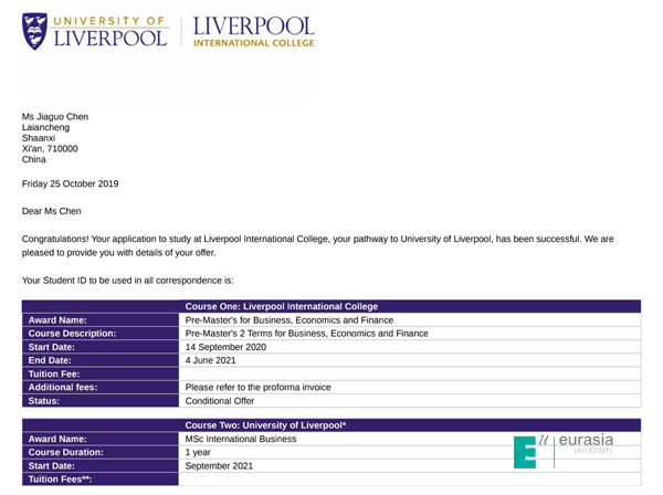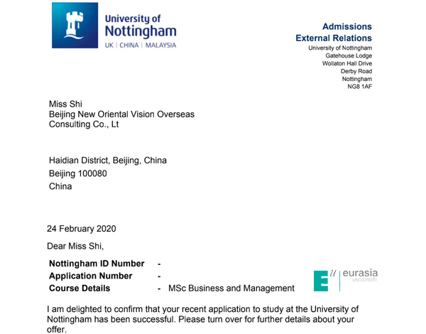 在欧亚学院学习四年以来,让我感受到了国际化的教学,尤其是在CFA班上课更是如此,因为有很多的双语课程。除此之外,在专业课的学习当中也有很多的以学生为中心的翻转课堂,这也和国际教学非常接轨。这样我越来越憧憬国外的学习生活。所以我就打算去英国留学了,由于专业课的成绩排名不错,所以申请的5所学校都发出了offer,因为我对投资很感兴趣,雷丁大学亨利商学院的ICMA CENTRE是一个很好的地方,因为这个是亨利商学院和国际资本市场协会所合作的,能够使用最新和最准确的公司数据,行业数据等来进行投资价值的分析。所以我最后选择了那里的Finance专业继续深造。