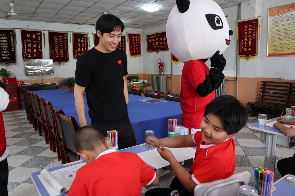 志愿者们和四个吉祥物还带领着小朋友们进行了趣味运动会,包括萝卜蹲、爱的抱抱。