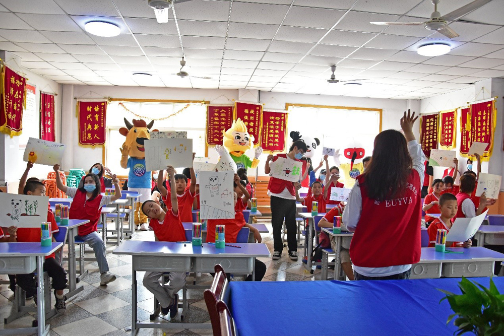 校青协的志愿者们向小朋友们宣讲了有关十四届全运会的知识。小朋友们发挥自己的想象力,进行了各种各样的涂鸦创作。