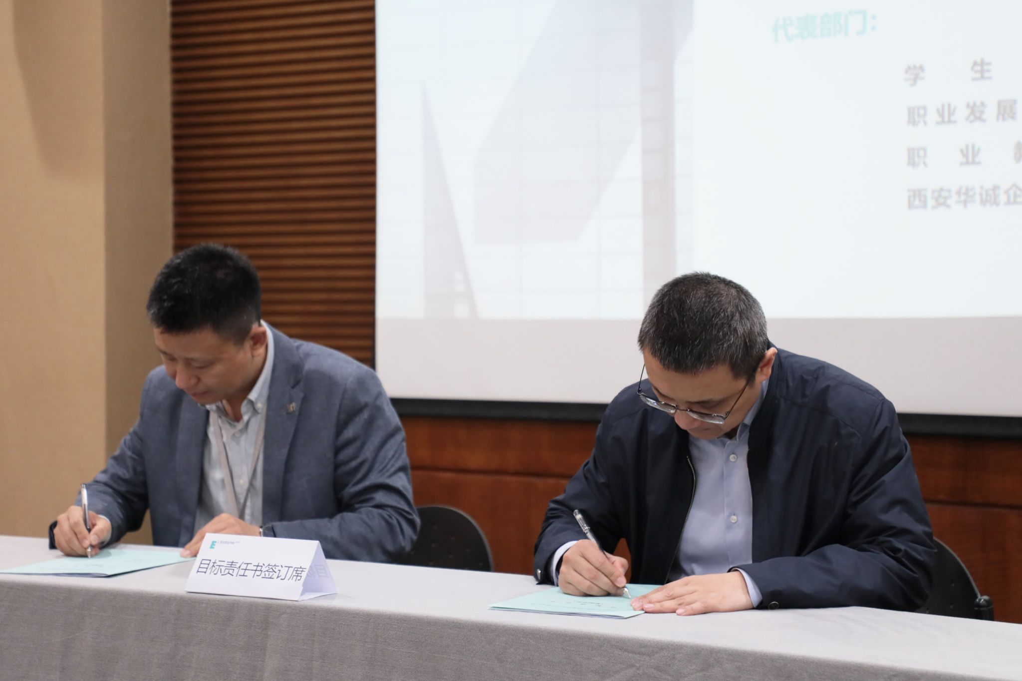 (图二)校领导与职能部门代表签订安全稳定暨消防安全目标责任书