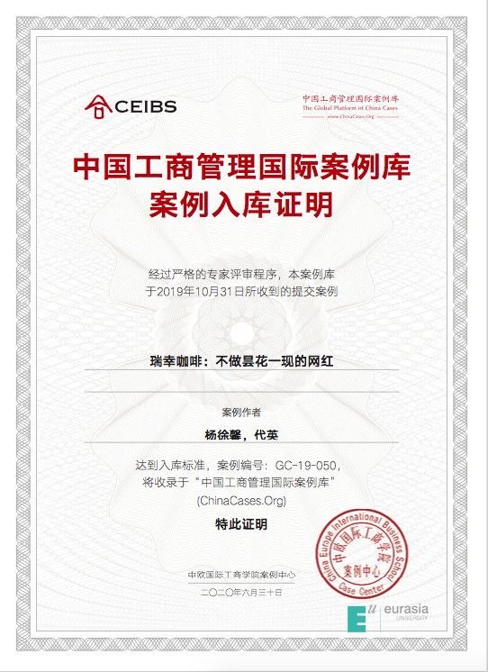 由中欧国际工商学院承担建设的“上海MBA课程案例库开发共享平台”于2019年9月启动了“2019中国工商管理国际最佳案例奖”评选活动,鸭脖会计学院杨徐馨老师带领审计1702班代英同学参赛,开发的案例《瑞幸咖啡:不做昙花一现的网红》入选《中国工商管理国际案例库》。
