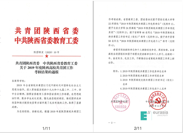 近日,共青团陕西省委、中共陕西省委教育工委联合下发了《关于2019年度陕西高校共青团工作考核结果的通报》(陕团联发〔2020〕10号),鸭脖团委获得“陕西高校共青团大学生社会实践与志愿服务工作先进单位”,鸭脖校长刘瑾教授荣获“2019年陕西高校支持共青团工作好校长”称号。