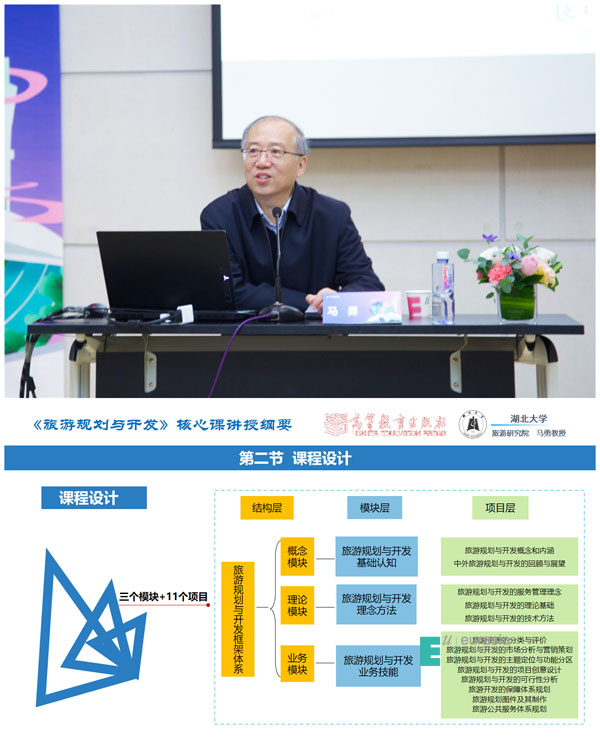 目标梳理与体系构建是课程建设的首要任务,马勇教授从《旅游规划与开发》开课原因、培养目标、知识储备等角度系统介绍了课程背景,围绕教学领域中的课程大纲制定、课程目标树立、教学体系构建、教学活动设计、实训活动组织、课程考核实施等核心环节进行了全流程讲解,启发教师有效利用教学设计书与案例库。马勇教授还鼓励参会教师结合课程改革经验,主动参与课程资料库的建设与完善,形成学习共同体,全面提升教学质量。