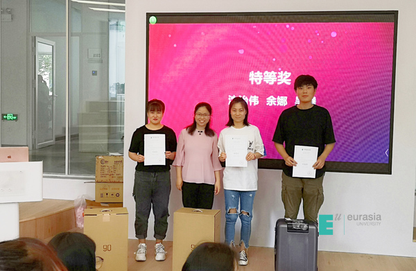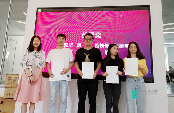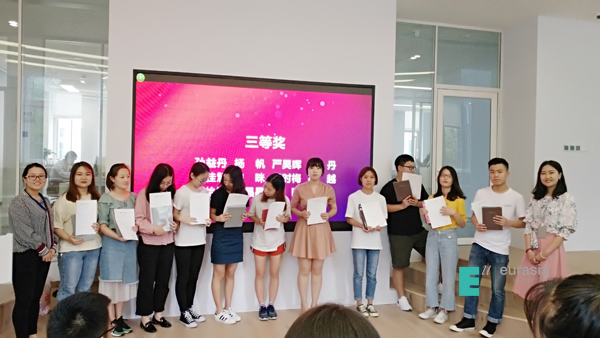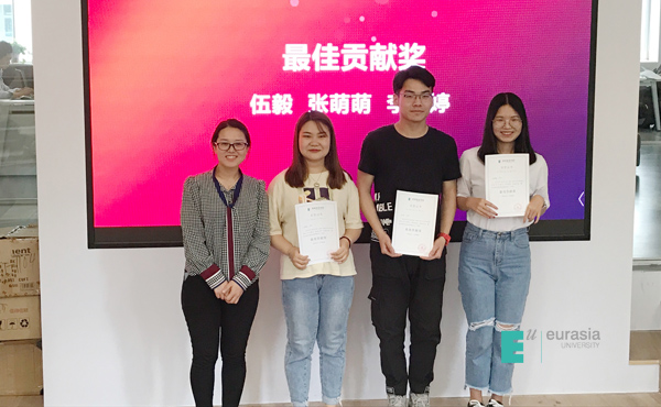 张璐老师随机抽取学生进行即兴发言,现场气氛活跃,学生说的最多的就是感谢,相信他们在以后的生活和职业中都像这次大赛一样能怀着感恩、勇敢的心,奋力向前。本次大赛指导老师-曹小菊老师为获得一等奖的6名同学以及获得二等奖的8名同学进行颁奖,大赛指导老师-张璐老师为获得三等奖的11名同学以及优秀奖的7名同学进行颁奖,颁奖彩蛋由曹小菊老师为三位同学颁发最佳贡献奖:伍毅、张萌萌、李怡婷,三位同学也分享了自己参赛的心路历程与获得成长。
