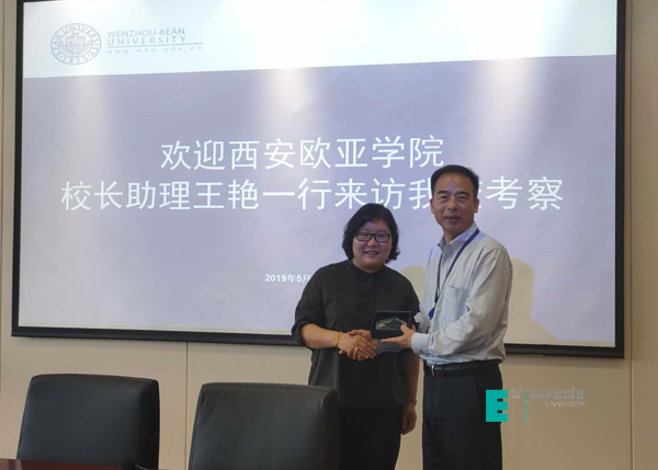 王艳助理等一行人在温州肯恩大学参观了学校宿舍,商学院楼,餐饮中心等地,并与温州肯恩大学进行了会谈,对方表示该校主要以美式校风格为主,公共空间的设计着重体现温州肯恩自由,交融的办学理念,并介绍了涉及学校的教学运行,财务运行,质量保障体系以及学生管理。该校的教学管理严格遵循美方的教学运行和质量监控,主要课程及质量控制都由美方负责,美方委派教学副校长,图书馆长以及教务部主任。目前该学校以教学为主,科研及学科建设暂缓。预计今明年启动申请硕士及博士点。温州肯恩大学的学生管理也值得我们借鉴,在学生管理上该校无班级概念,施行社区制,扁平化,共分为六个中心,以住宿服务中心为例,主要负责住宿管理,教育支持,学生管理,每个中心都有书院导师以及学生助理队伍,学生助理有工资合同。其学生管理的特色实现高度的学生自治,每楼有学生楼长,每层有层长,每个层长负责十二间宿舍近20-30人。 在会谈结束时王艳助理代表欧亚学院送上礼品并拍照留念。