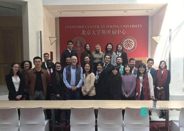 之后,各位学者带领来访研究生一行,参访了北京大学斯坦福中心。北大斯坦福中心商科主任、斯坦福大学商学院Frank Hawke教授亲切接待了来访人员,并进行了关于中美商业合作的历史与发展的主题讲学,蔺睿博士与各位学者就Hawke教授在讲座中关于理解中美经贸关系发展的一些富有见地的学术观点进行了进一步讨论。