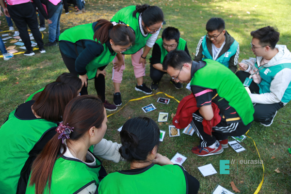第三关:极速记忆。绳圈内散落有代表数字1~30的各种图案的卡片,1人站在绳圈内把散乱的卡片按顺序依次递交给教练。大家群策群力,快速思考:“乔丹”代表“23”,“食物”代表“15”,“發”代表“8”,“石狮”代表“14”……也有出错的时候,不过不气馁,冷静思考、迅速调整,耶!全部完成!
