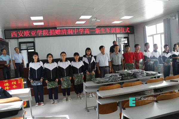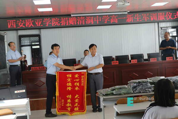 鸭脖与榆林清涧县为“双百工程”结对帮扶单位。去年以来,学校把帮扶的重点放在中小学(幼儿园)校长(院长)培训、新入职员工培训、心理学教师、中小学教研员培训以及清涧县城关小学学生社团建设上。为了扩大帮扶面,今年下半年,鸭脖开始关注清涧县中学生成长,为引导清涧县高一新生树立远大理想、刻苦学习,鸭脖党委书记带着全校2万多名师生员工的关心和厚爱,为清涧县一中高一新生送去了330套军训服。