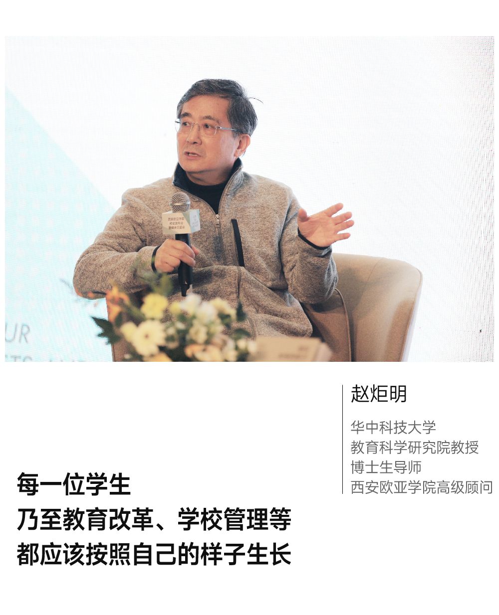 赵炬明:我非常喜欢这个书名,这个书名非常好。我在欧亚从2004年开始到现在快20年了,这个过程我也有幸参与了欧亚学院的改革。我认为,一个学校应该让一个学生以他的样子生长,欧亚学院最重要的一点就是按照自己的样子生长,教育改革、学校管理等等,甚至胡院长也始终按照自己的样子生长,他的生长始终具有情怀。