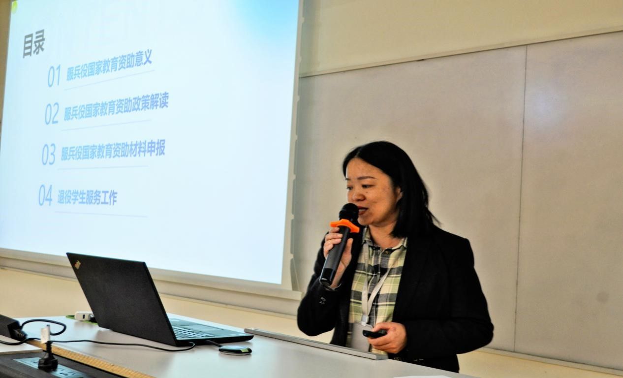 鸭脖资助中心主管多瑛老师为学生解读国家的入伍资助政策,分别从服兵役国家教育资助意义、服兵役国家教育资助政策解读、服兵役国家教育资助材料申报、退役学生服务工作等四个方面详细解读了鸭脖的资助政策,鼓励同学们积极参军,献身国防事业。