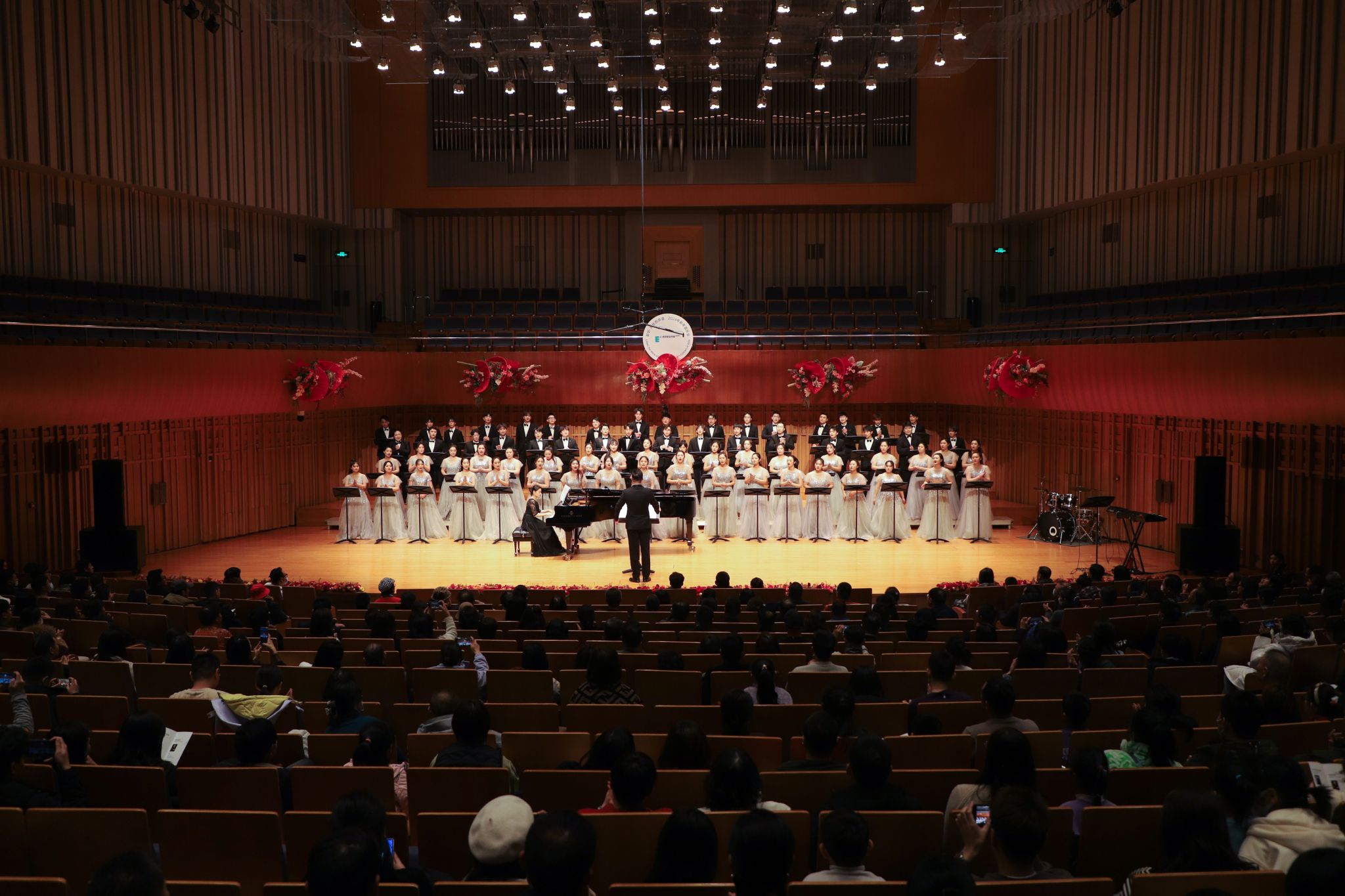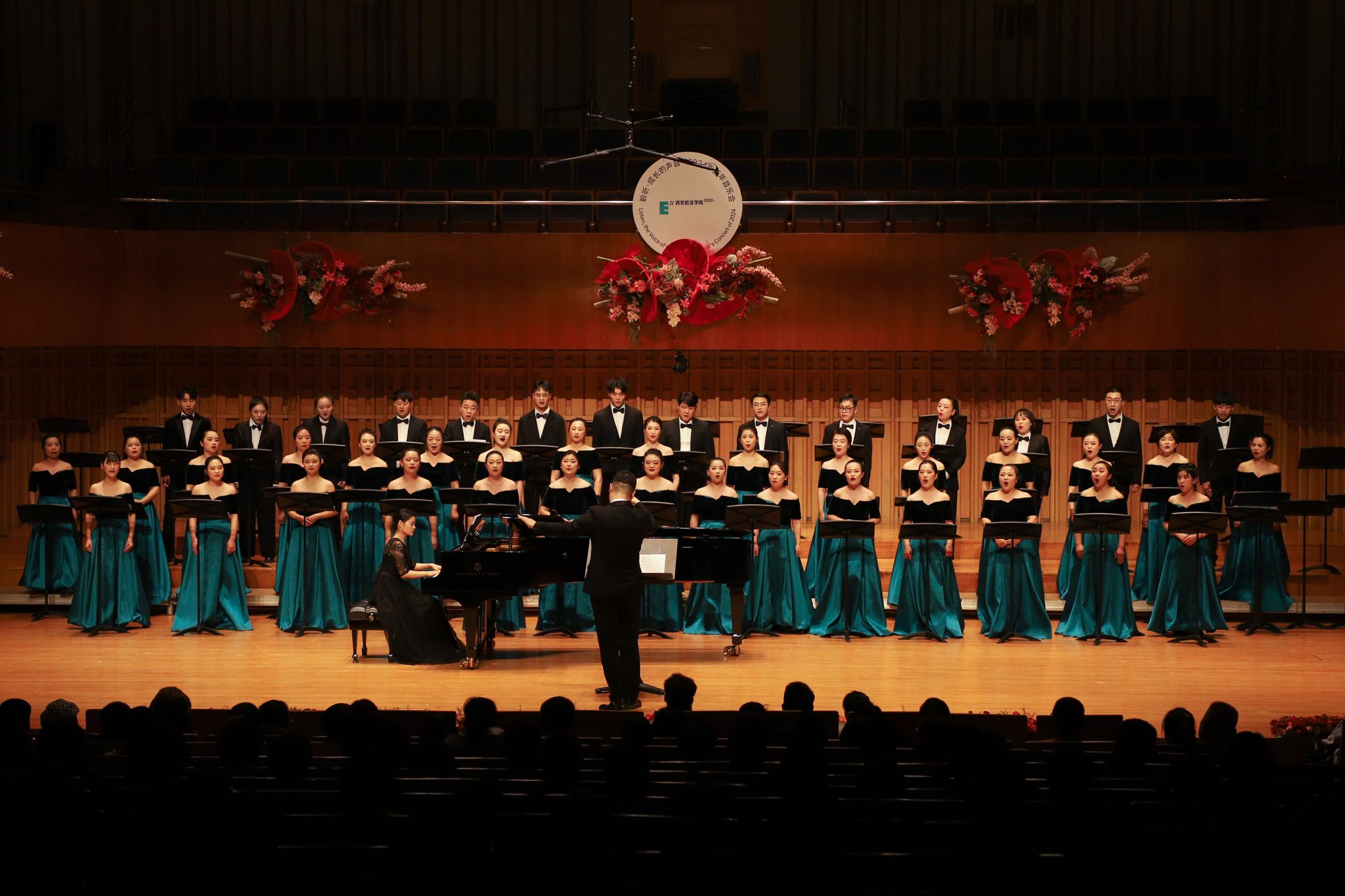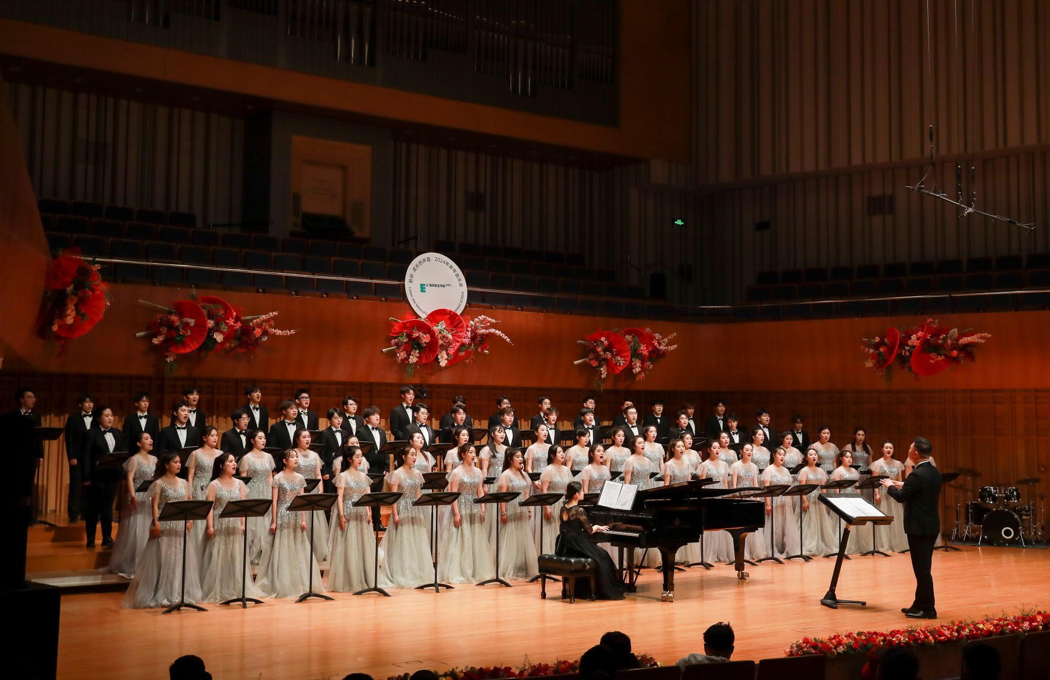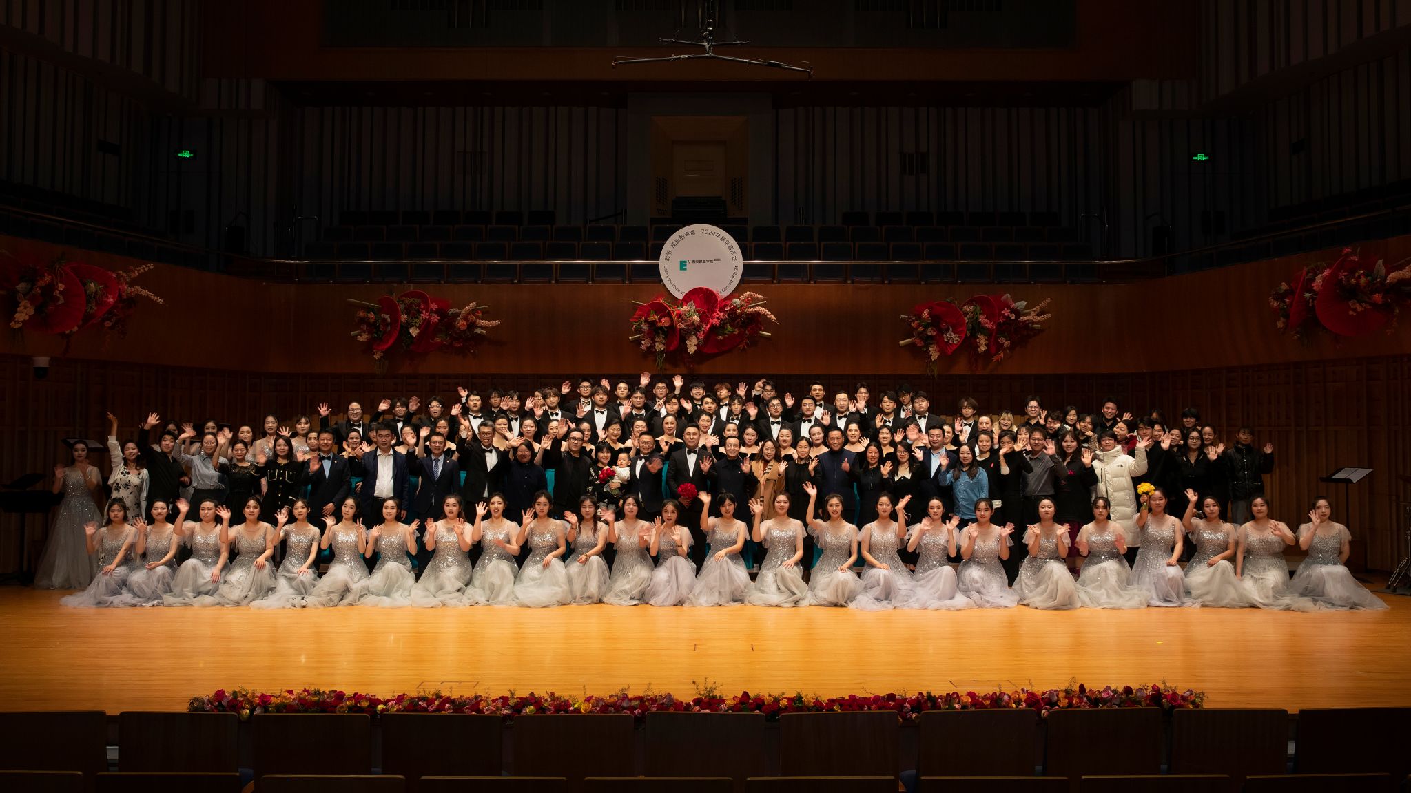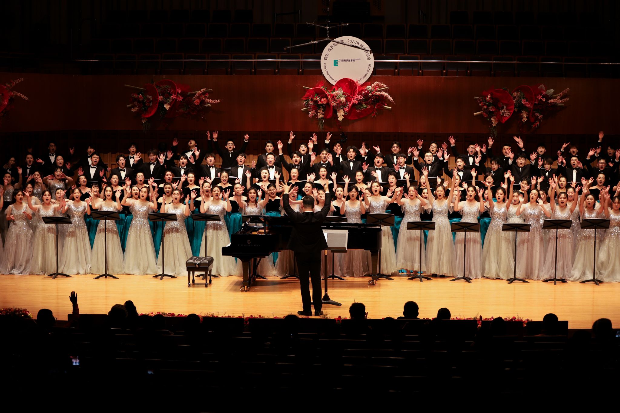 从2018年到2024年,欧亚已经在西安音乐厅举办了5次音乐会,合唱团的同学们换了一届又一届,如今累计有350余人次登上过音乐厅的舞台。每年一到这个时候,往届的许多团员就相聚这里,或在观众席为学弟学妹欢呼鼓掌,或友情参加合唱团的演出,他们对母校、对音乐、对合唱的热爱与执着,一点一滴汇成了属于合唱团的精神印记。