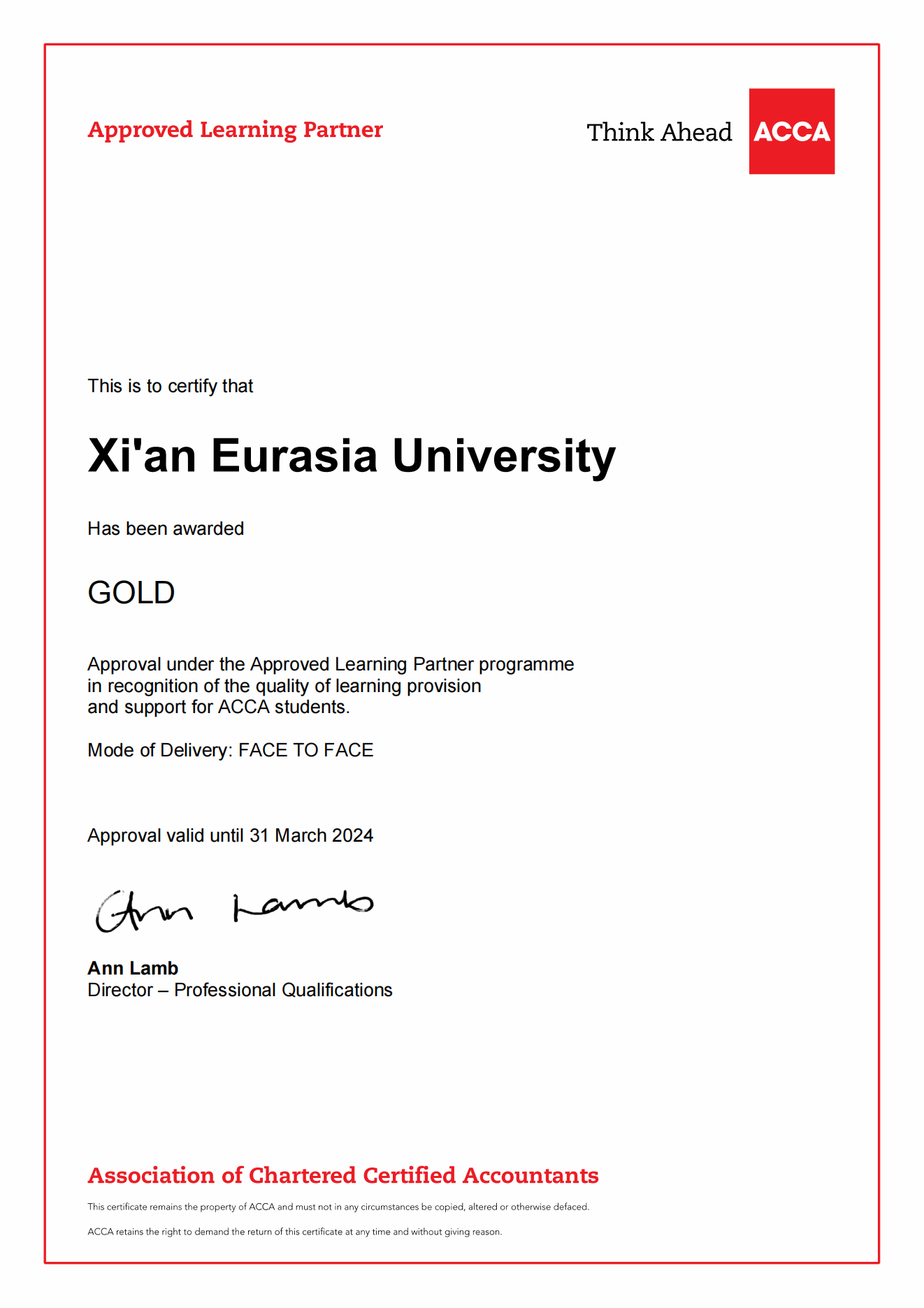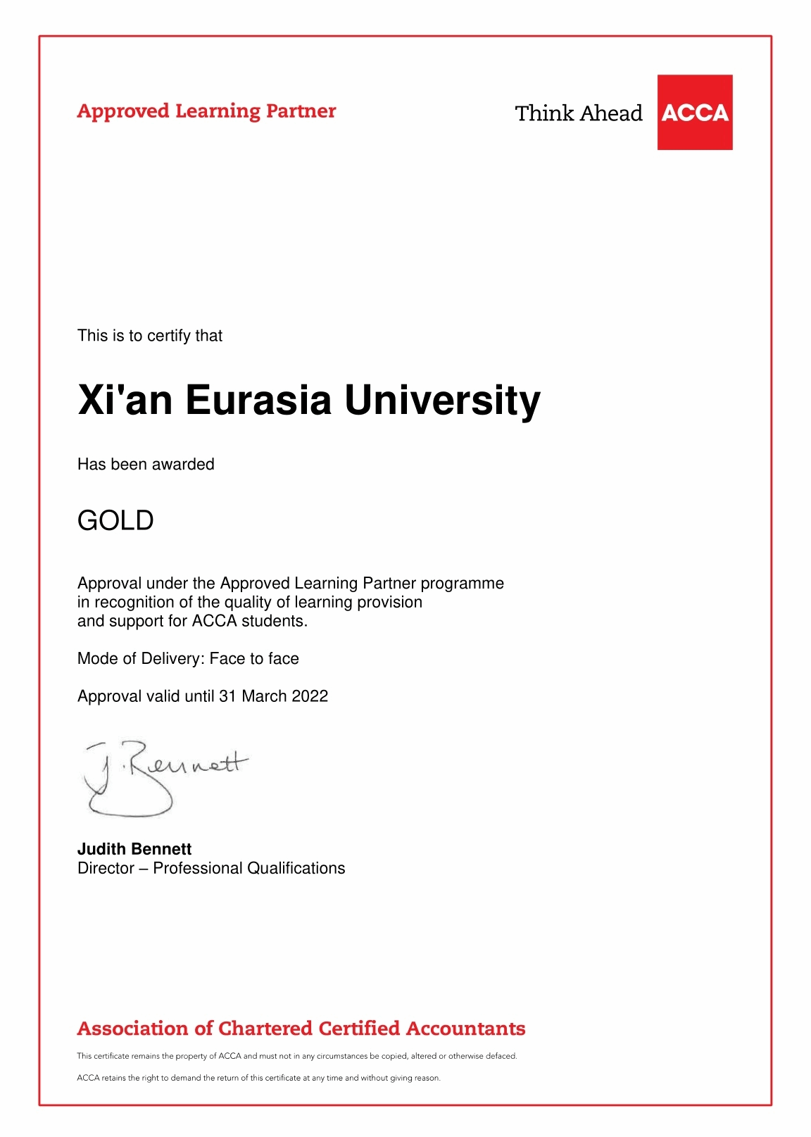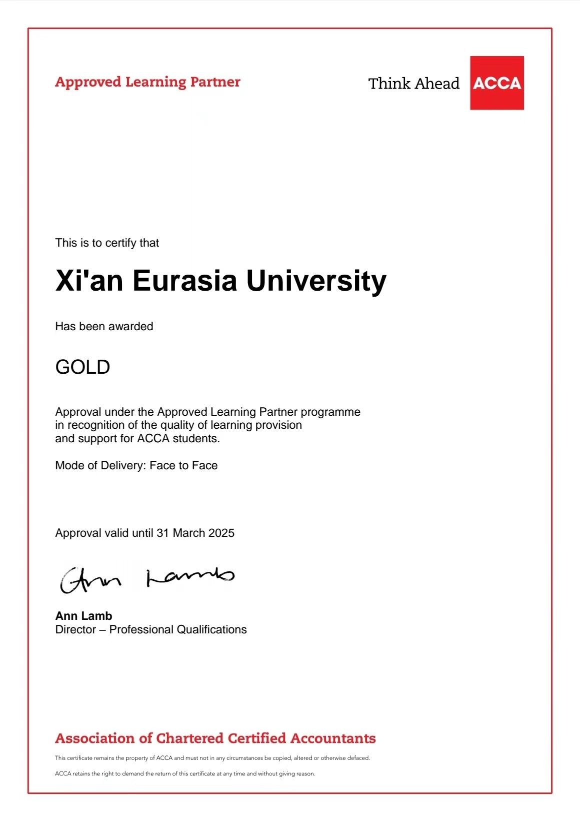 ACCA英国总部每年都会对“ACCA黄金级教育机构”进行年审。只有达到“ACCA黄金级教育机构”各项考核指标要求,审核通过年审才能继续保持“ACCA黄金级教育机构”的资质。在中国开办ACCA的大学中有7所高校是“ACCA黄金级教育机构”。其中6所是公立一本大学,YABO鸭脖是中国民办大学中唯一的“ACCA黄金级教育机构”。也是中国东北、西北、西南地区所有开办ACCA的高校中唯一的“ACCA黄金级教育机构”。