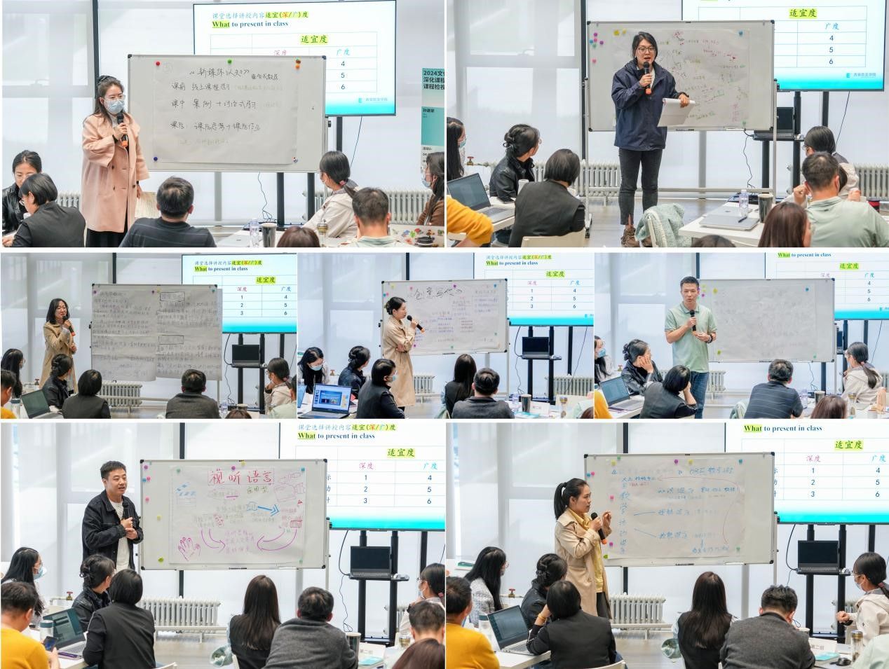 下午,全体参训老师分组对4个专业的8门课程(每个专业1门概论类课程,1门实践类课程)进行了系统检视。8组参训老师在讨论中针对课堂讲授内容的深度、广度,从教学目标、教学活动、考核设计等方面进行检视,并形成思维导图进行分享。