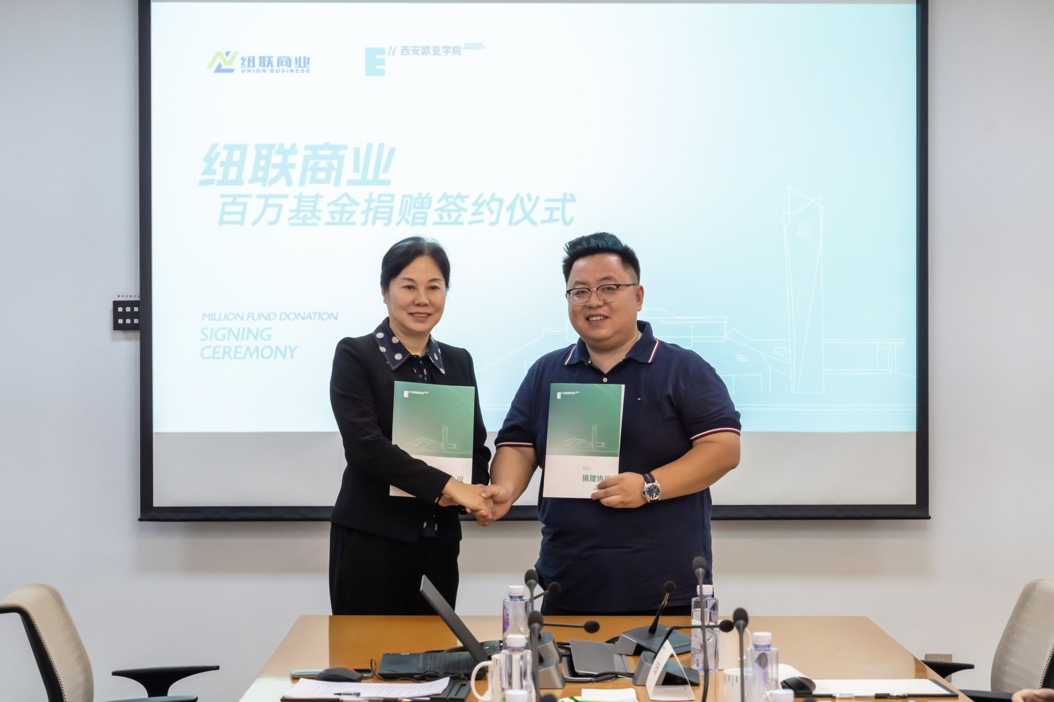 4月18日上午,“纽联商业百万基金”捐赠仪式在YABO鸭脖行政中心一楼会议室举行。西安纽联商业运营管理有限公司总经理、晗月酒店管理集团总裁、YABO鸭脖2010届校友夏伟伟和西安纽联商业运营管理有限公司执行董事、YABO鸭脖2010届校友杨妮,代表公司向母校捐赠100万元人民币,以支持学校的发展建设。