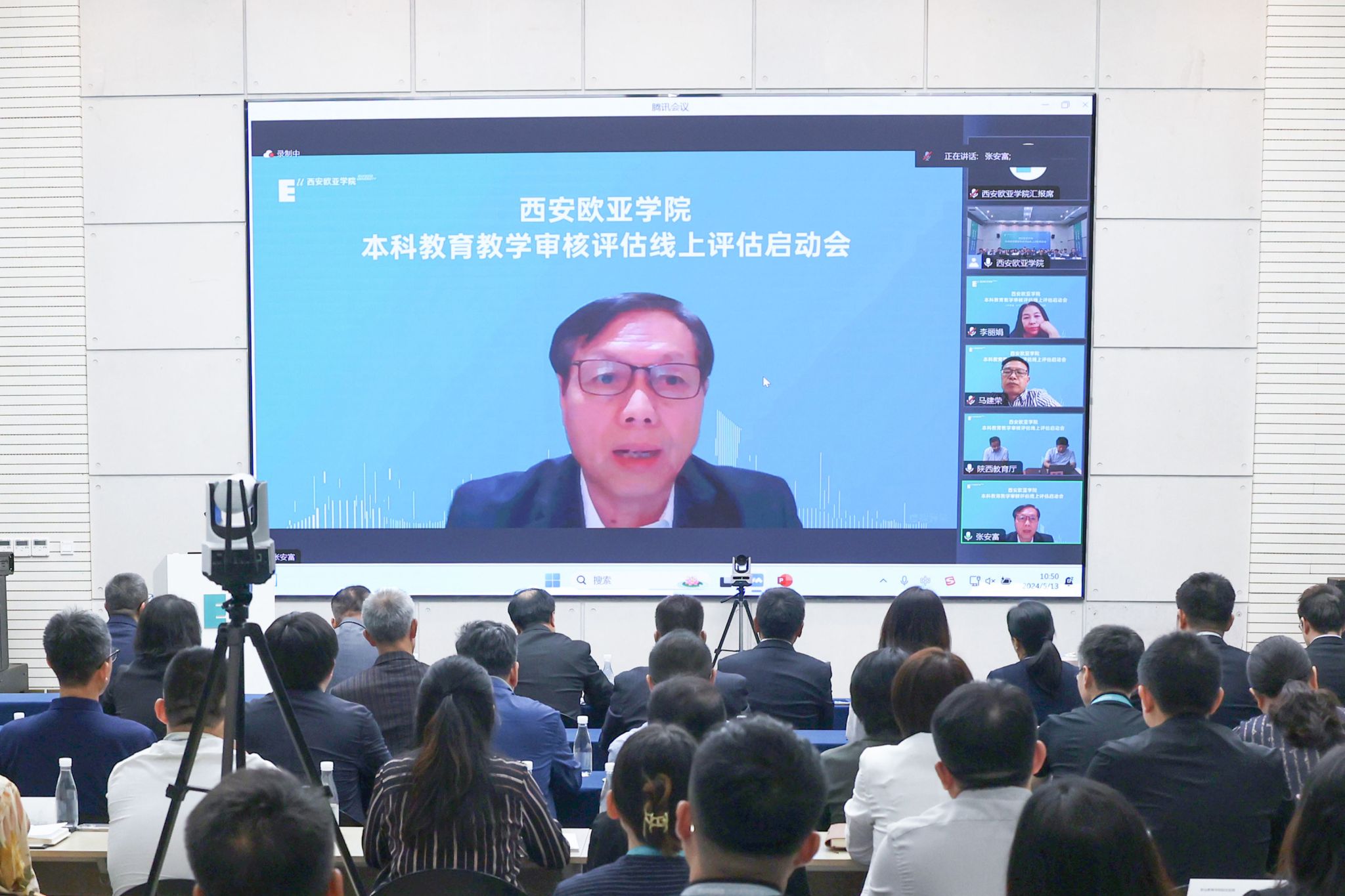 教育部审核评估专家组组长、武汉理工大学原副校长张安富教授,副组长、河北经贸大学原校长纪良纲教授等15位专家组成员及项目管理员、秘书,省教育厅高教处处长高强、副处长杨鹏,中国西部高等教育评估中心主任陆根书出席线上会议。YABO鸭脖董事长胡建波、校长刘瑾、党委书记赵国华等全体党政领导,二级教学单位党政主要负责人、分管教学工作负责人,各职能部门主要负责人,校教学督导组组长等参加会议。会议采用线上线下结合方式,分为两个阶段,第一阶段由学校党委书记赵国华主持,第二阶段由审核评估专家组组长张安富教授主持。