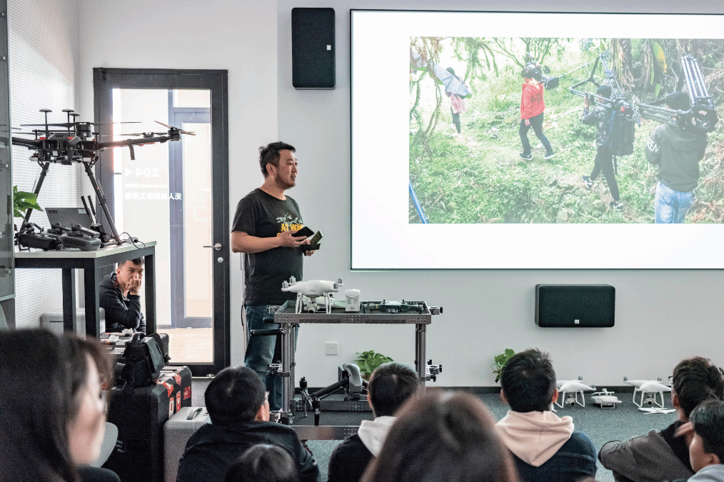 以行业标准指导教学。通过引入行业知名专家、企业真实项目与产业尖端技术,实行进阶式工作坊教学。如:学院建立具备国内影响力和区域影响力的无人机航拍工作室,以大疆签约摄影师刘夙培作为指导教师,为学生提供更加专业的实践机会,实时触达产业动态。