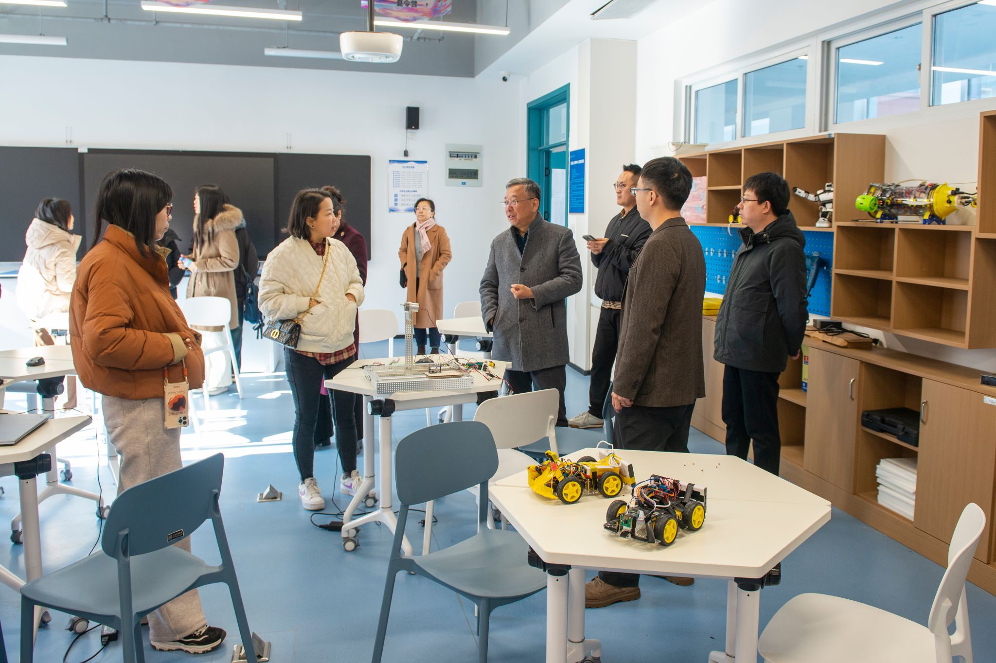 在海尔学校副校长韩潇带领下,鸭脖教师参观了海尔学校多个区域,了解学校如何通过课程设置和教学方式,实行学生个性发展与创新素质培养,探索设计思维与实际体验并重、深度学习与学术研究多模块融合的创新人才培养模式。该教育模式强调不仅要培养学生的理论知识,还要培养其实际操作能力和解决问题的能力。海尔学校将学生视作一个能够创造和贡献的主体,而不是一个只能被动接受知识的容器,提出“师生合一”的理念。