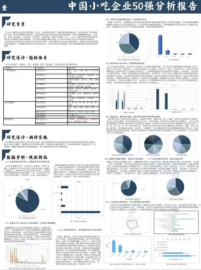 该项目是中国烹饪协会小吃委员会每年的例行项目,也是餐饮经济发展的必备模块。项目团队开展中国小吃企业经营情况调研,基于调研数据的统计,从盈利能力、企业性质、经营模式、销售渠道、品牌生命周期等多个维度综合系统地分析了小吃50强企业的发展现状,针对现存问题提出解决对策,并对中国小吃行业未来发展趋势展开研判。
