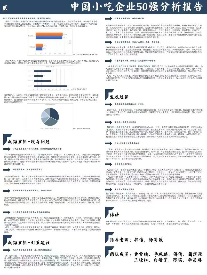 依托于此次餐饮数据报告的真实调研与中国烹饪协会的深入合作,借助学院“社会服务实践教学周”的良好契机,韩洁带领8名学生共同输出《中国小吃50强企业分析》的数据报告。