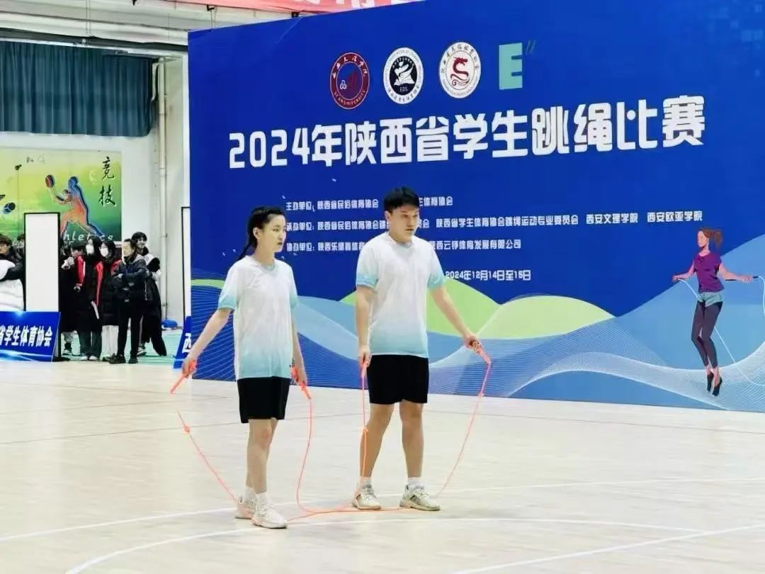 在比赛时其实我们也出了一些差错,在参加大学生甲组混合组双人车轮跳花样规定基础套路的比赛时,不同的动作为一整套循环,于越在比赛过程中缺失了一套动作,但是源于我们长久以来的默契,我自然而又流畅地接住了下个动作。最终,我们成为全场完成度、完整度最高的队伍,获得了2024年陕西省学生跳绳比赛一等奖。