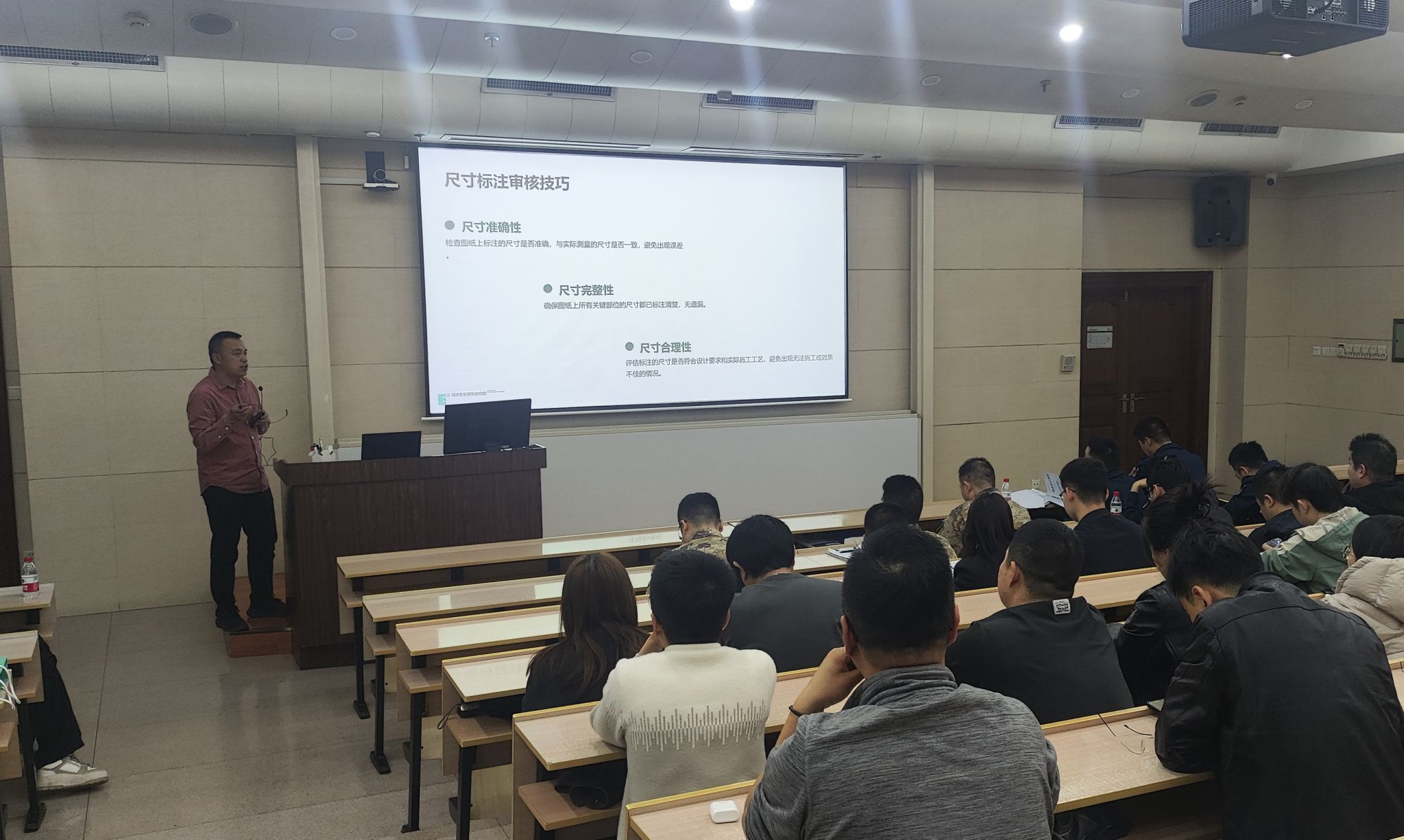 陕西馨迪景观装饰工程有限公司殷爱民分享了项目实操环节的图纸审核、材料选样、二次深化设计、质量通病防治等内容,深受西京医院项目管理人员的欢迎。