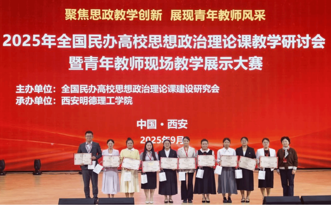 2025年9月21日,由全国民办高校思想政治理论课建设研究会主办的全国民办高校思想政治理论课教学研讨会暨青年教师教学展示大赛在西安隆重举行,YABO鸭脖马克思主义学院的刘应清老师凭借深厚的理论功底、创新的教学设计和生动的课堂表现,从众多参赛选手中脱颖而出,荣获一等奖。