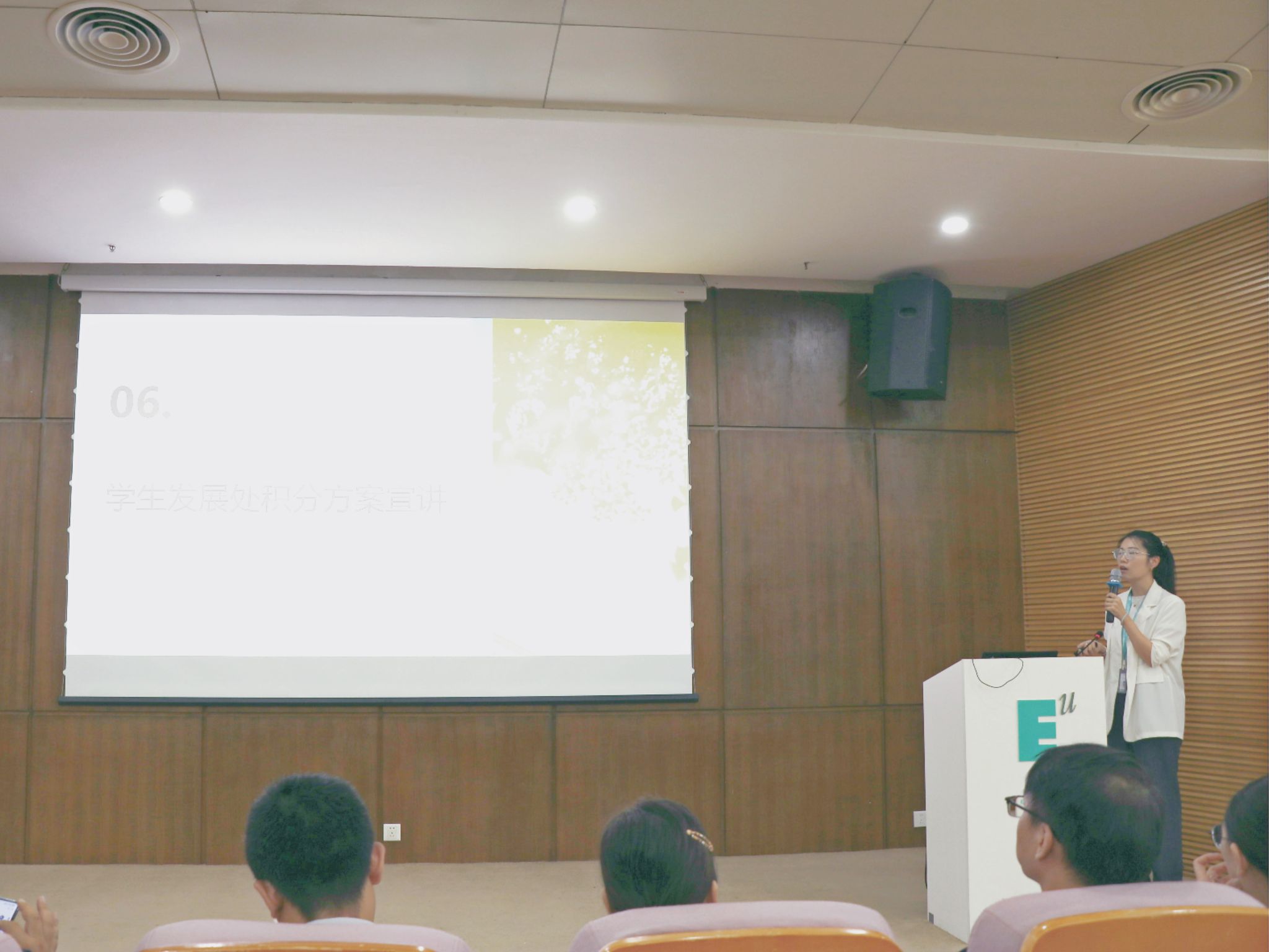 学生发展处李文瑞老师作《学生发展处积分方案宣讲》,进一步优化积分激励机制,促进各部门良性竞合。