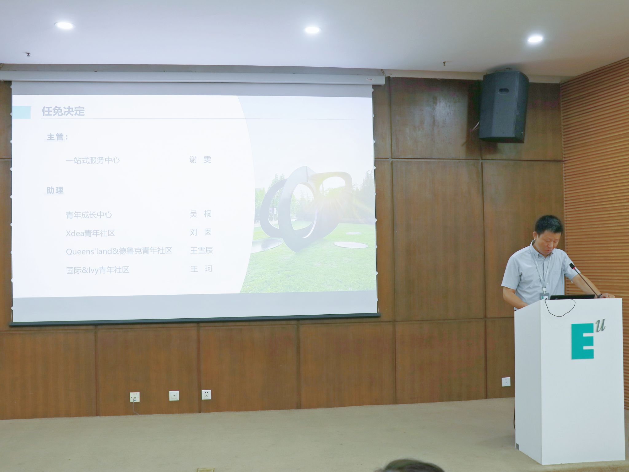 会议伊始,举行了新员工入职仪式。Xdea青年社区新员工郑方亮老师、Queens'land青年社区王亚楠老师进行自我介绍;学生发展处处长董杨老师为郑方亮老师与王亚楠老师佩戴工牌并发放新员工入职礼包。
