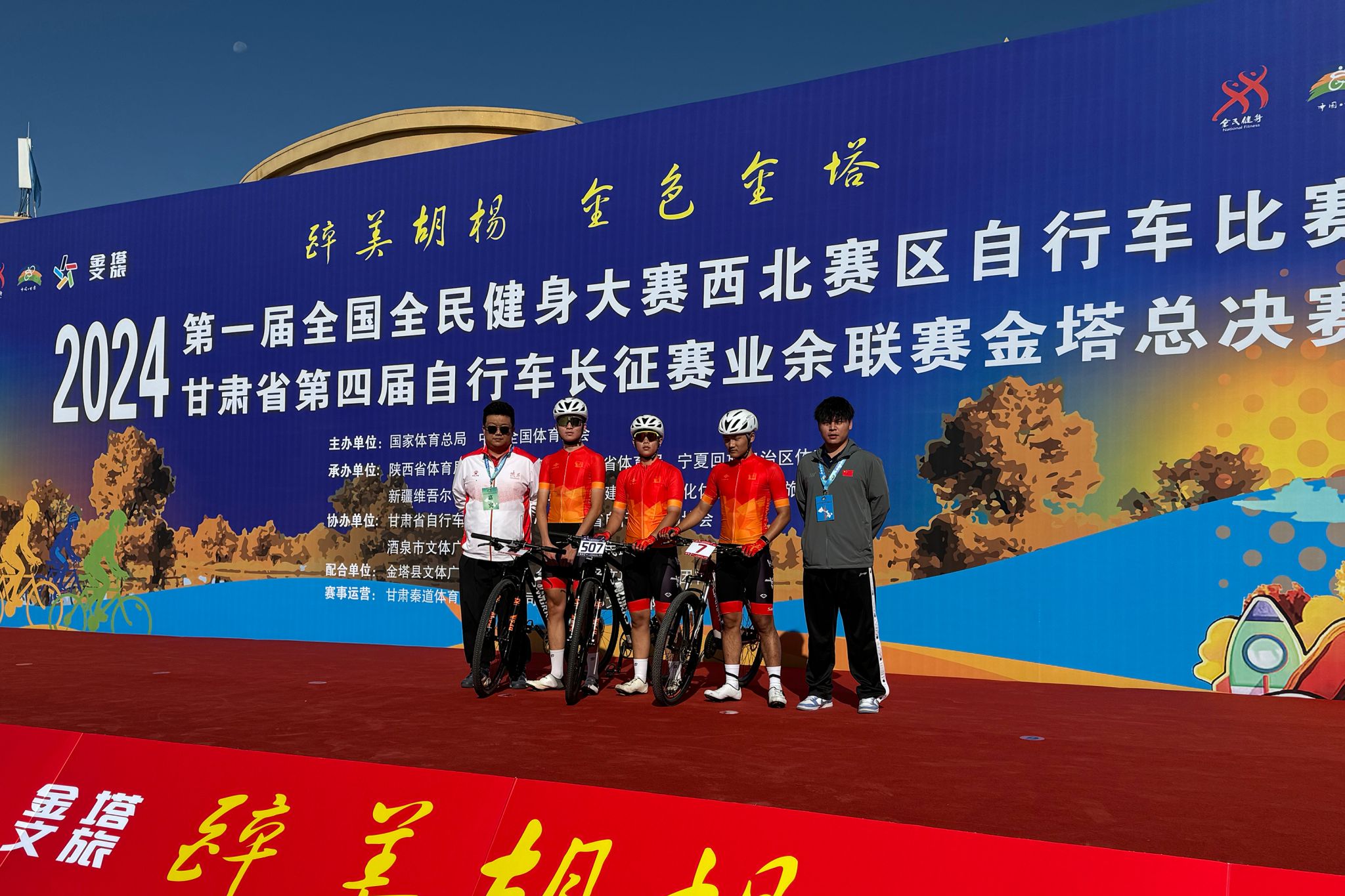 9月22日,由国家体育总局、中华全国体育总会主办,陕西、甘肃、青海、宁夏、新疆4省区体育局和新疆生产建设兵团文化体育广电和旅游局承办的第一届全国全民健身大赛(西北赛区)自行车比赛暨甘肃省第四届自行车长征赛业余联赛(金塔)总决赛开赛。来自全国16个省市自治区64个俱乐部的428名自行车选手在金塔沙漠胡杨林景区展开激烈角逐。鸭脖征途单车俱乐部队员入选陕西省代表队参加了本次比赛,并在男子青年组、女子精英组等多个单项斩获佳绩。