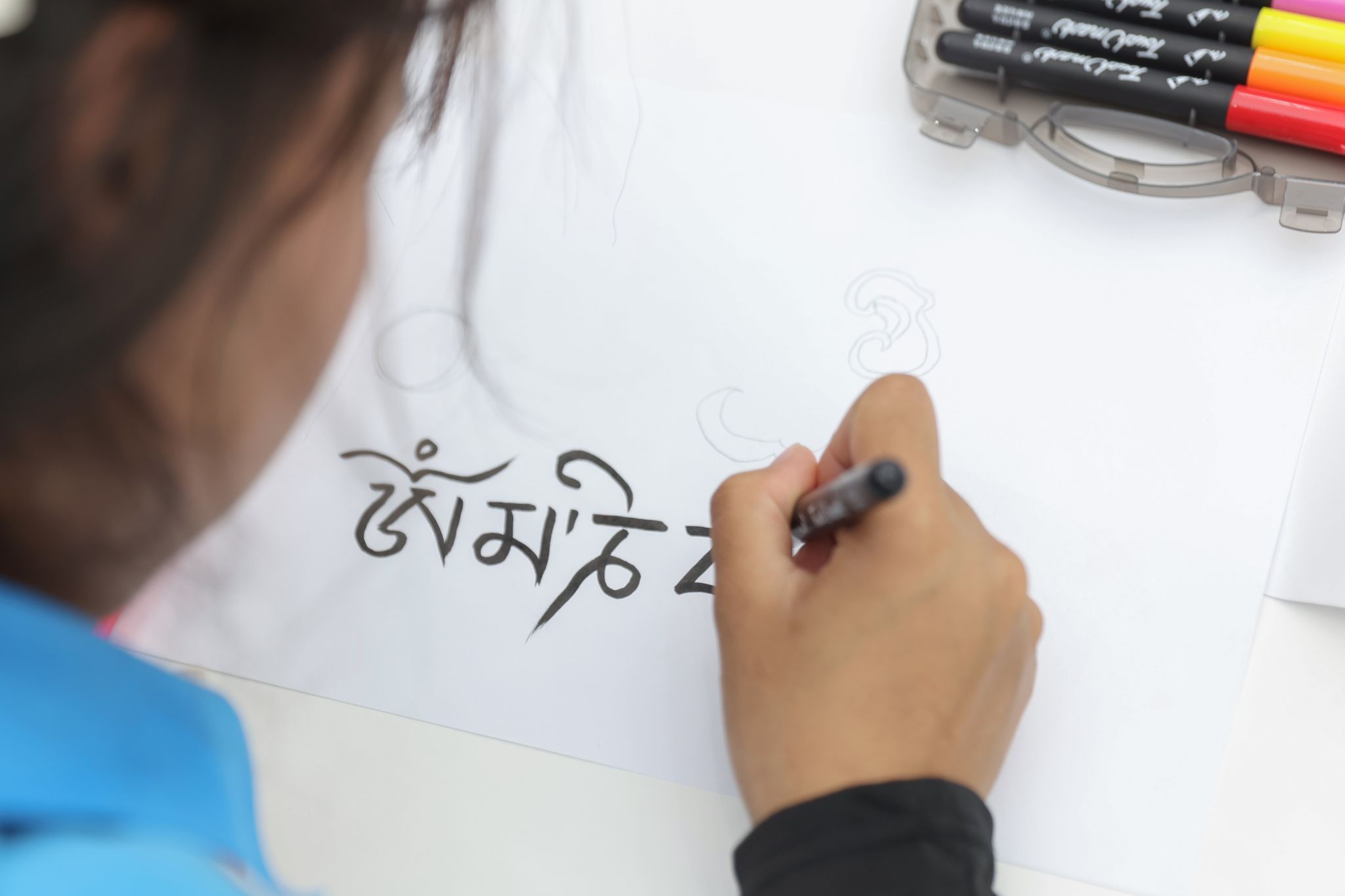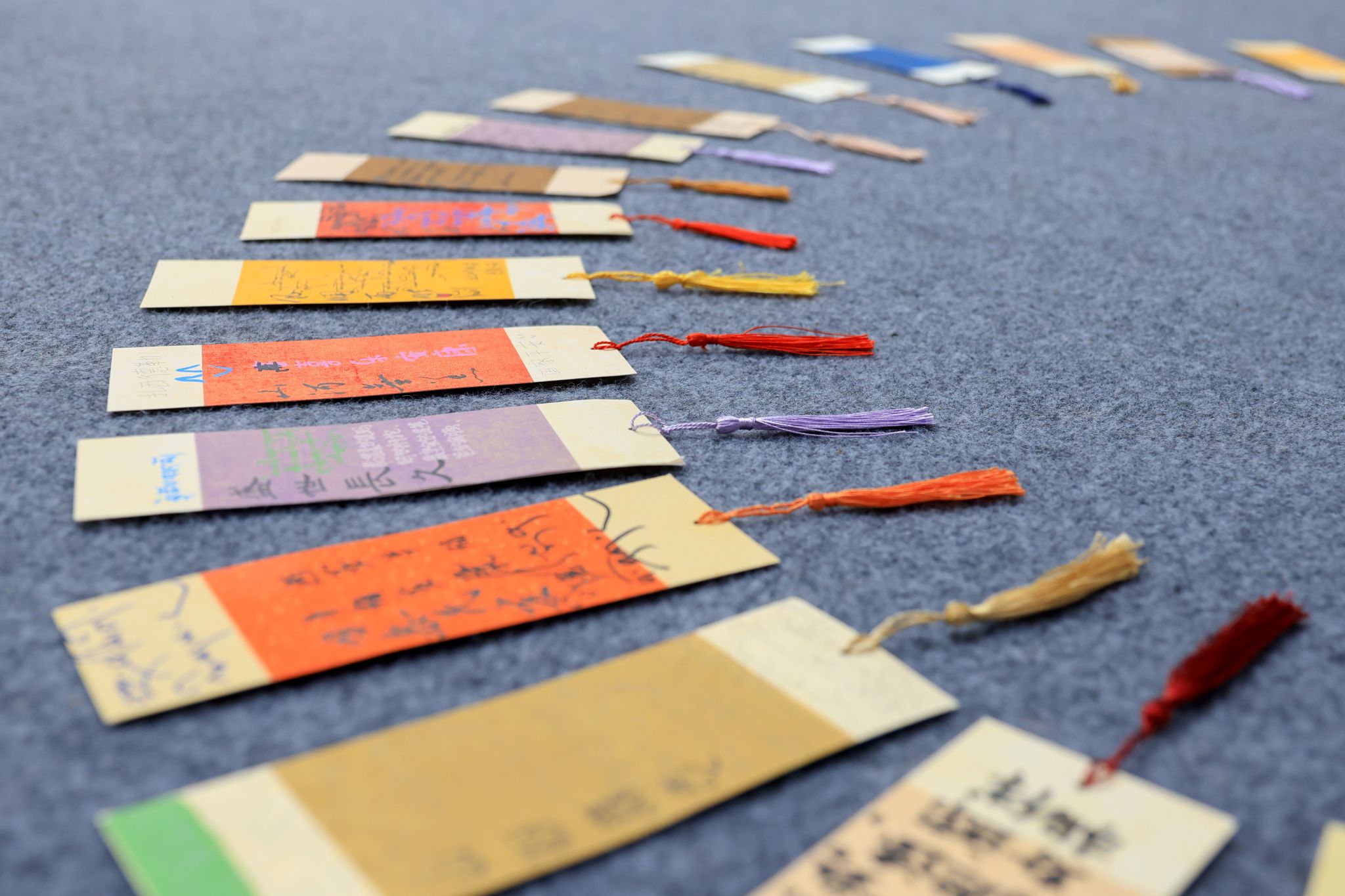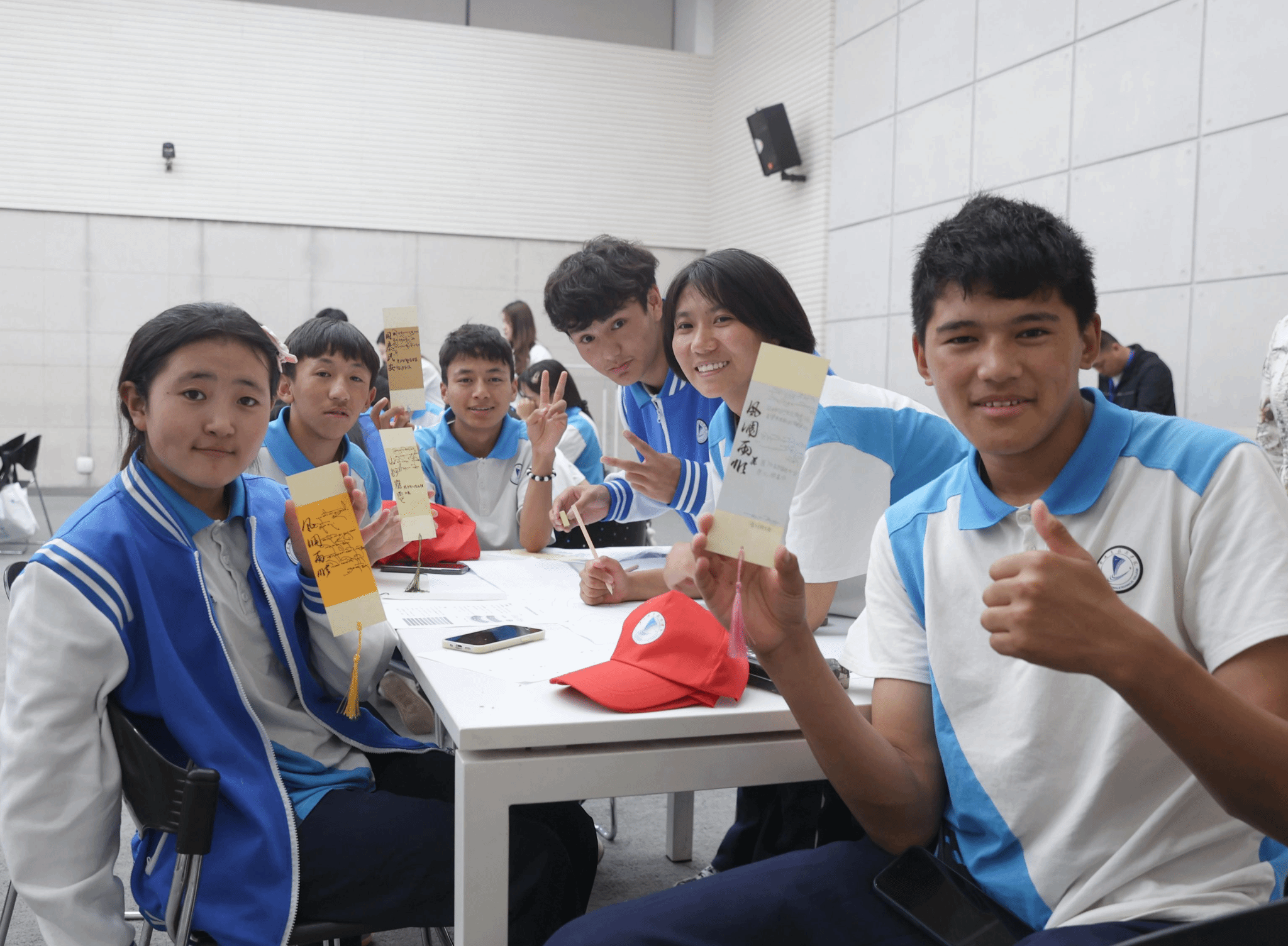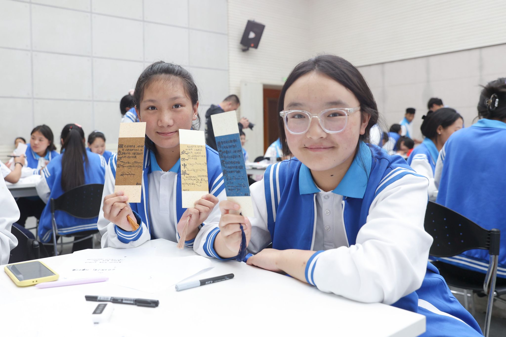 工作坊还特别设计了“给长安的一封信”环节。在古色古香的书签上,欧亚学子与阿里班藏族学子以笔墨共同为祖国、为古长安及西安送上了真挚的祝福。欧亚学子在书签上用毛笔写下“国泰民安”、“千秋华夏”的祝福语,而藏族学子则以藏文书写“吉祥如意、福泽绵长”等祝祷词,藏文与汉字相映成趣,祝福美好交融,成为此次研学独一无二的印记。书信为媒、文物为桥,这些作品也将随研学团队带入下一站陕西历史博物馆,与馆藏文物开启一场“跨越时空的对话”。