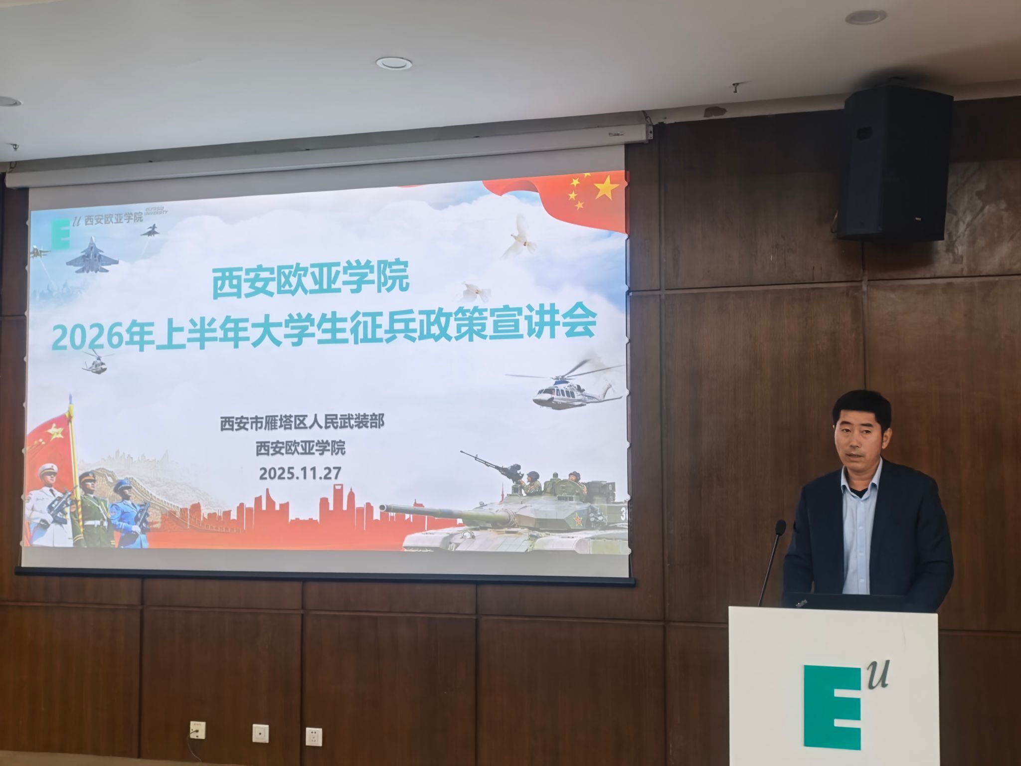 下午2时30分,校稳定办常务副主任强建旗首先代表学校致辞。他站在服务国防和军队现代化建设、落实“为党育人、为国育才”初心使命的战略高度,对雁塔区人武部长期以来给予鸭脖征兵工作的悉心指导与大力支持表示衷心感谢。在全面回顾和总结鸭脖2025年征兵工作成效后,他向在场学子发出深情而有力的号召:“强国必先强军,强军必先强兵。人民军队正朝着建成世界一流军队的目标阔步前进,这为有理想、有学识、有担当的大学生提供了施展才华、建功立业的广阔舞台。希望欧亚学子能勇担历史重任,把个人理想融入强军实践,抓住时代机遇,积极应征入伍,让青春在火热的军营中淬炼成钢,让生命在为祖国和人民的奉献中焕发绚丽光彩。