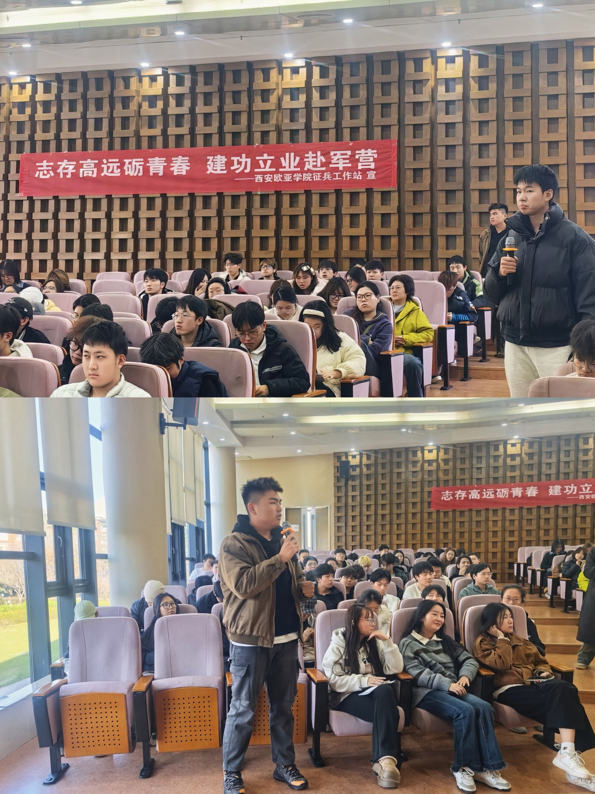 随后,雁塔区人武部副部长刘洪栋为同学们带来了一场内容丰富、阐释精准的权威政策宣讲。他并未局限于简单的条款罗列,而是从“天下虽安,忘战必危”的忧患意识切入,深刻阐述了新时代青年投身国防事业的重大意义。他围绕“为什么要入伍参军”、“为什么要从西安应征入伍”等根本性问题,结合当前国家安全形势与部队发展需求,进行了深入浅出的剖析。紧接着,刘刘洪栋副部长系统解读了报名应征的基本条件、程序流程,并重点从政治荣誉、学业保障、经济优待、就业扶持、成长进步及大学生参军独特优势等六大维度,全面梳理了国家与地方出台的一系列极具吸引力的优待政策。他的讲解高屋建瓴又贴近实际,既有战略高度又充满人文温度,有效扫除了同学们心中的疑虑,极大地激发了大家的参军热情。在互动环节,刘副部长与杨斌参谋还就同学们关心的各类热点问题进行了现场解答,气氛活跃。