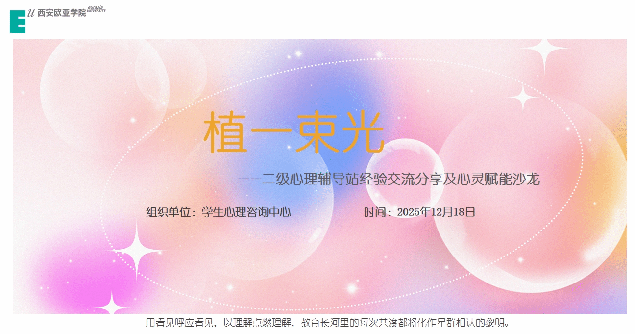 教育长河里的每次共渡,都是星群相认的黎明,本次“植一束光”沙龙不仅加强了各二级心理辅导站之间的联结,更深化了心理育人队伍对育人使命的理解,我们在这里种下一束光,这束光,是专业,是情怀,是持续生长的力量;这束光,照亮自己,也照亮每一个与我们相遇的年轻生命。这束光,将从我们的心中出发,在校园里传递,最终汇聚成一片温暖而明亮的星河,温暖每一位恰好经过的行人。