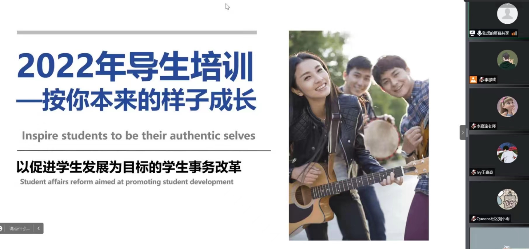 9月4日上午,鸭脖2022级导生岗前培训及导生换届大会在线上举行,学生发展处处长助理张成老师、李嘉瑜老师、2022级新生辅导员及导生团队百余名师生参与本次导生岗前培训。