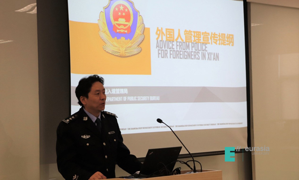 培训会开始,由国际合作与交流中心留学生负责人申芸老师介绍了本次活动的目的以及到场嘉宾。随后,西安市出入境管理局外管科代军峰科长对留学生来到古都西安学习表示欢迎,并告诉留学生应该遵守中国有关法律法规,以及学校的规章制度,注意人身和财产安全。