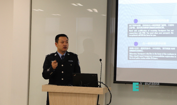 会议的主要培训内容由出入境管理局王慧警官为大家做主要讲解。王警官分别从出入境相关法律法规、外国人来华日常生活注意事项以及重要联络方式三个方面进行了阐述,内容涉及签证办理、居留许可、就业、旅行等方面。