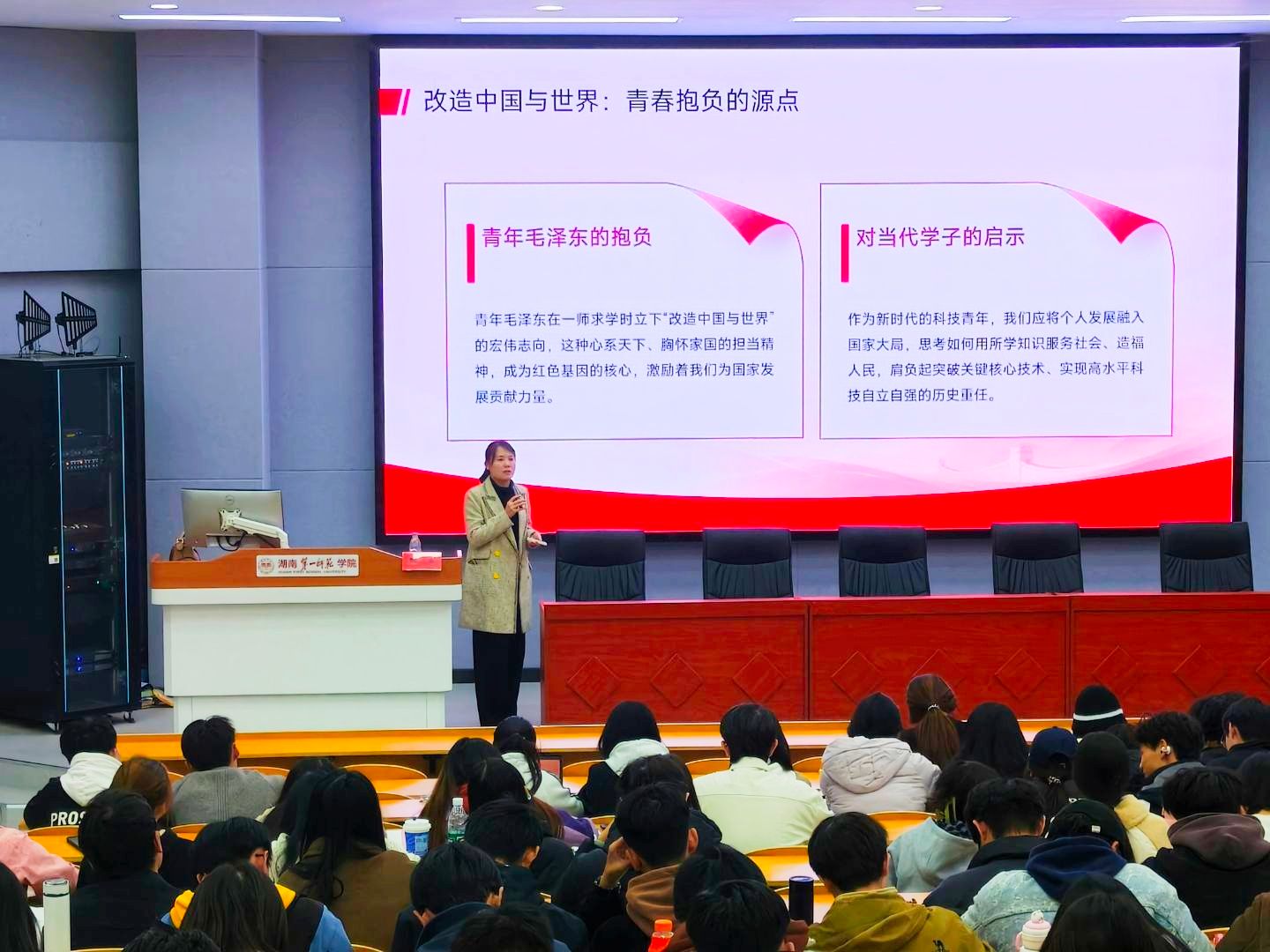 党课伊始,陈奕以“红色校史照初心”为切入点,将学校历史转化为鲜活的精神坐标,激励学员们将这些精神力量转化为科技报国的实际行动。她指出,当前国际科技竞争激烈,高端芯片、工业软件、精密传感器等核心技术仍受制于人,同时科技伦理、数据主权、绿色制造等问题也日益凸显,对青年学子提出了更高要求。她寄语全体学员,要以“两个一百年”奋斗目标为时间标尺,把个人青春融入科技强国建设的三十年征程,以校史红色基因为根基,以国家科技需求为导向,将汗水洒在实践一线,让红色青春在科技报国的伟大征程中绽放光芒。