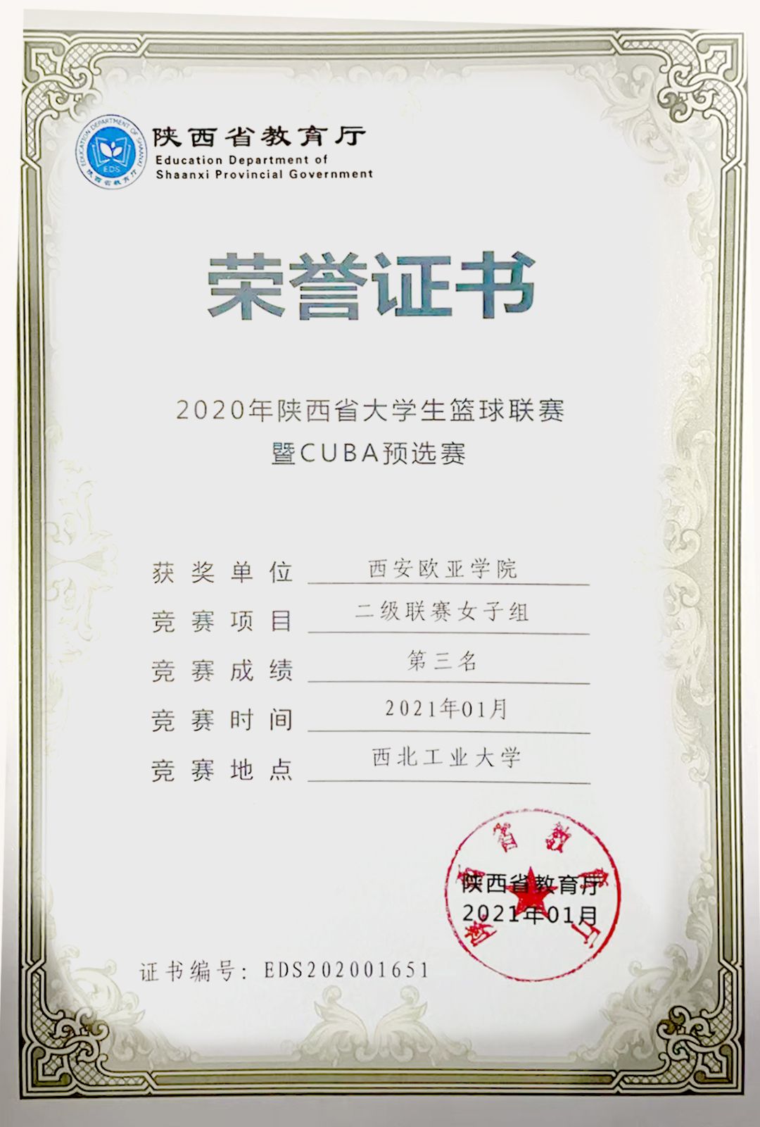 当年,陈信汝和队友们奋力拼搏,最终拿到了第三名的好成绩,担当后卫的陈信汝成为球队的头号得分手。2022年6月,欧亚女篮整体实力更进一步,陈信汝所在的团队又捧获了2021年陕西省大学生篮球联赛暨CUBAL预选赛二级联赛的亚军。