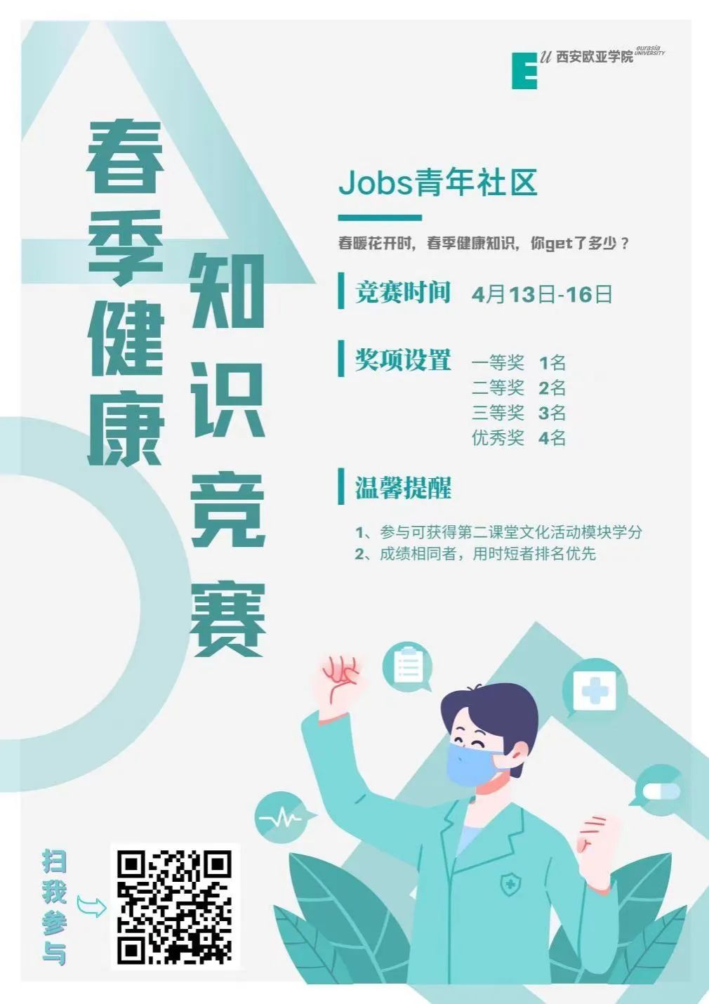 今年4月是第35个爱国卫生月,为进一步落实习近平总书记对爱国卫生运动作出重要指示,提升师生健康素养,提升劳动教育理念,第一青年社区分党委开展了以“春季健康”为主题的知识竞赛,竞赛题目涉及爱国卫生运动常识、春季传染病常识以及健康生活相关题目。