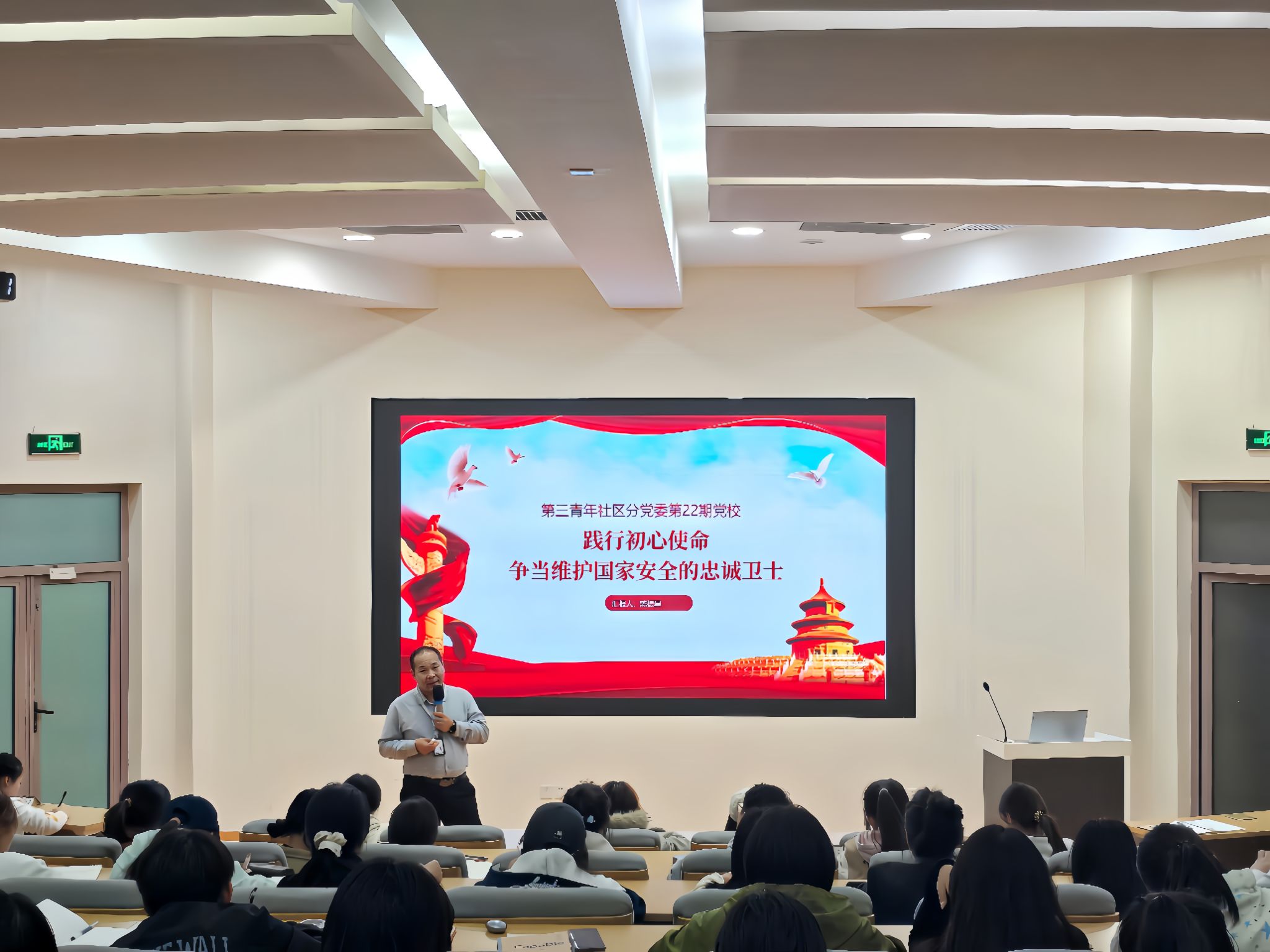 为深入学习贯彻总体国家安全观,增强大学生入党积极分子的国家安全意识和责任担当,第三青年社区分党委于11月4日在西C-001开展了一场以“践行初心使命 争当维护国家安全的忠诚卫士”为主题的专题党课。本次党课由第三青年社区分党委书记陈振星主讲,110名入党积极分子参与现场学习。