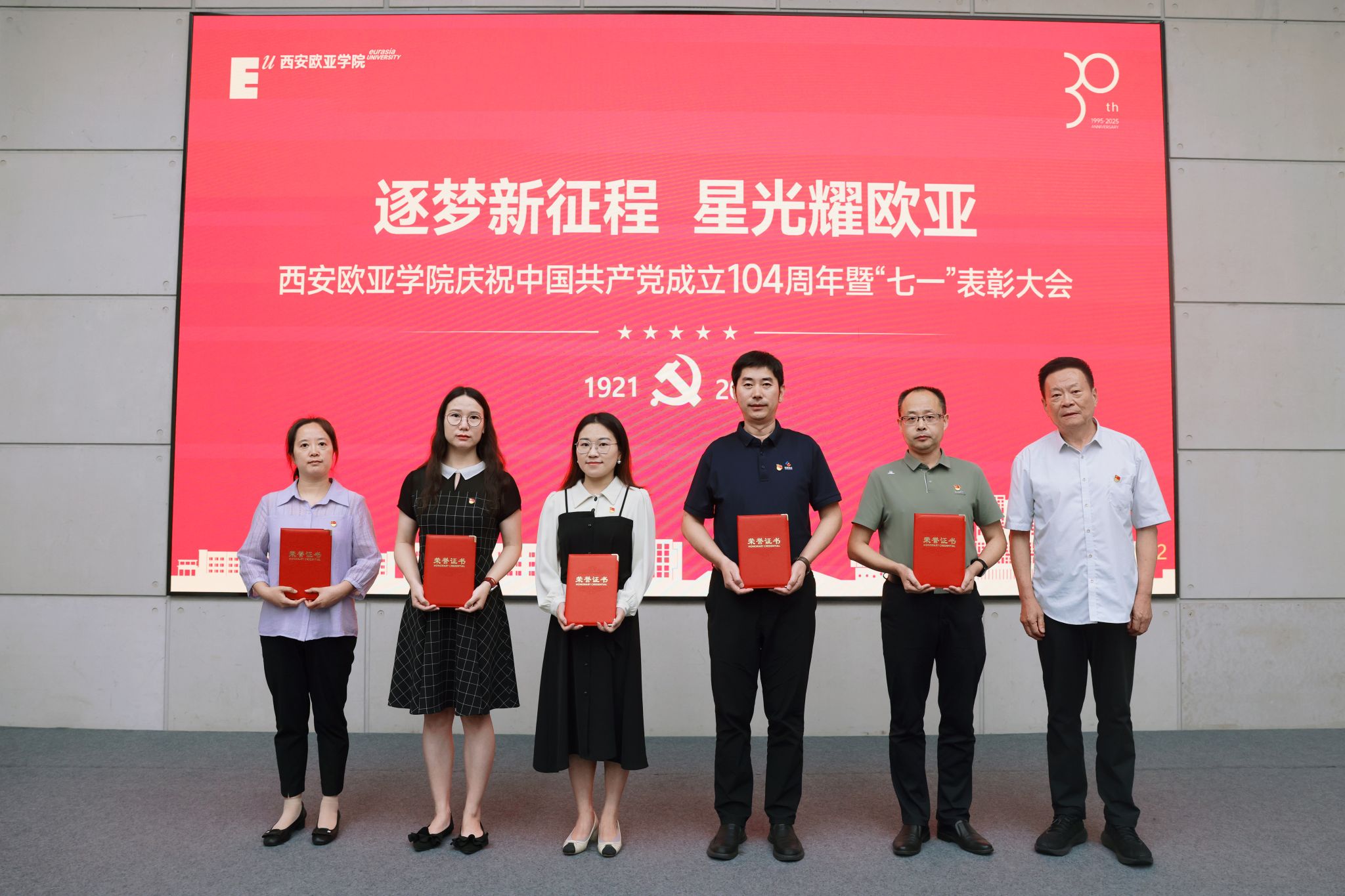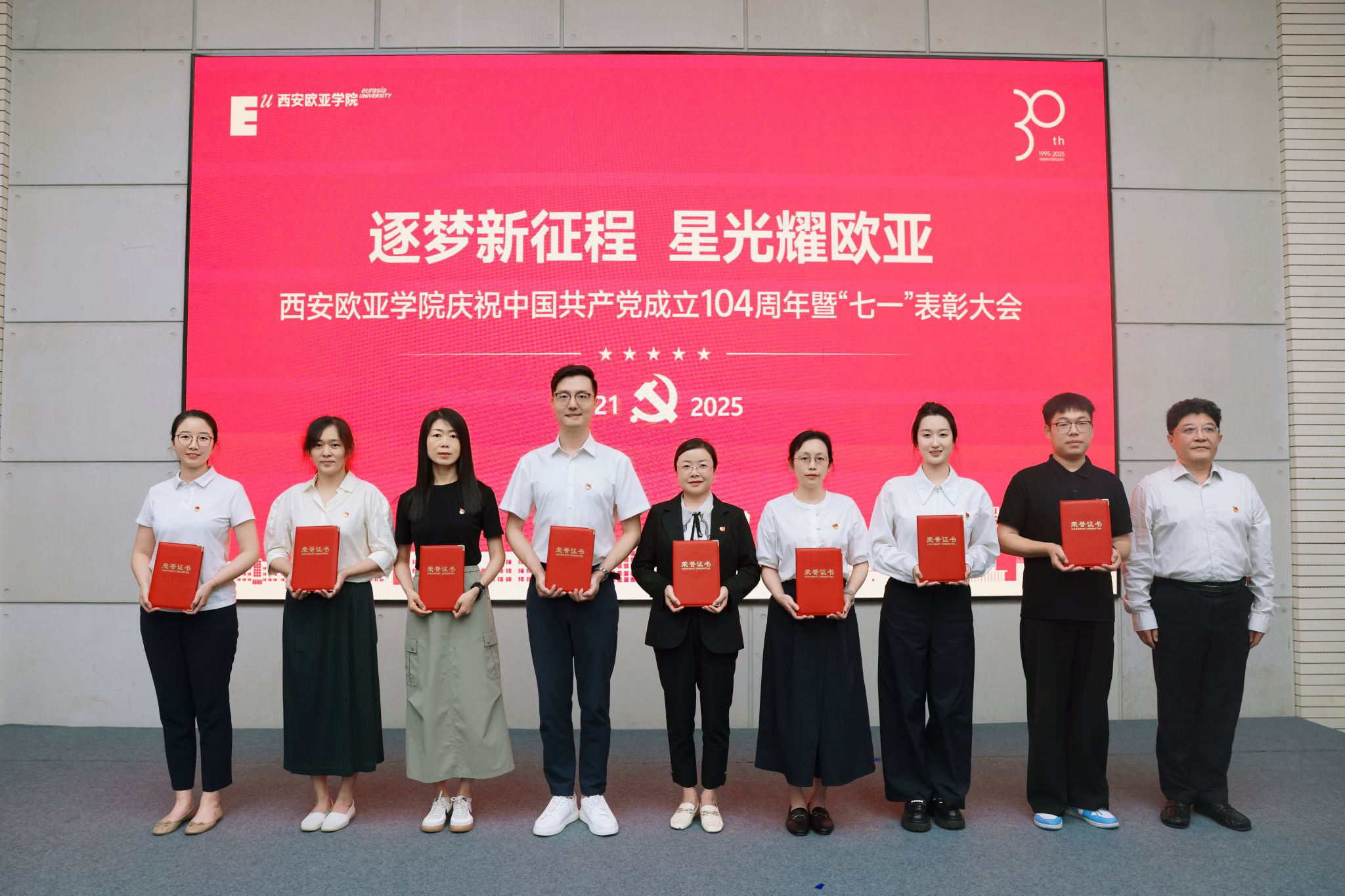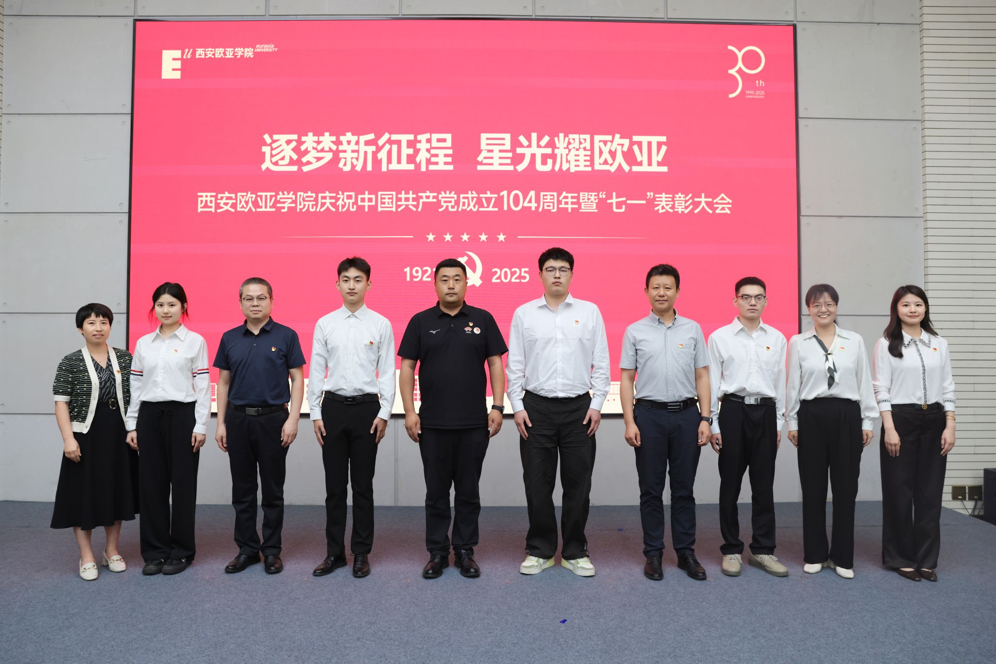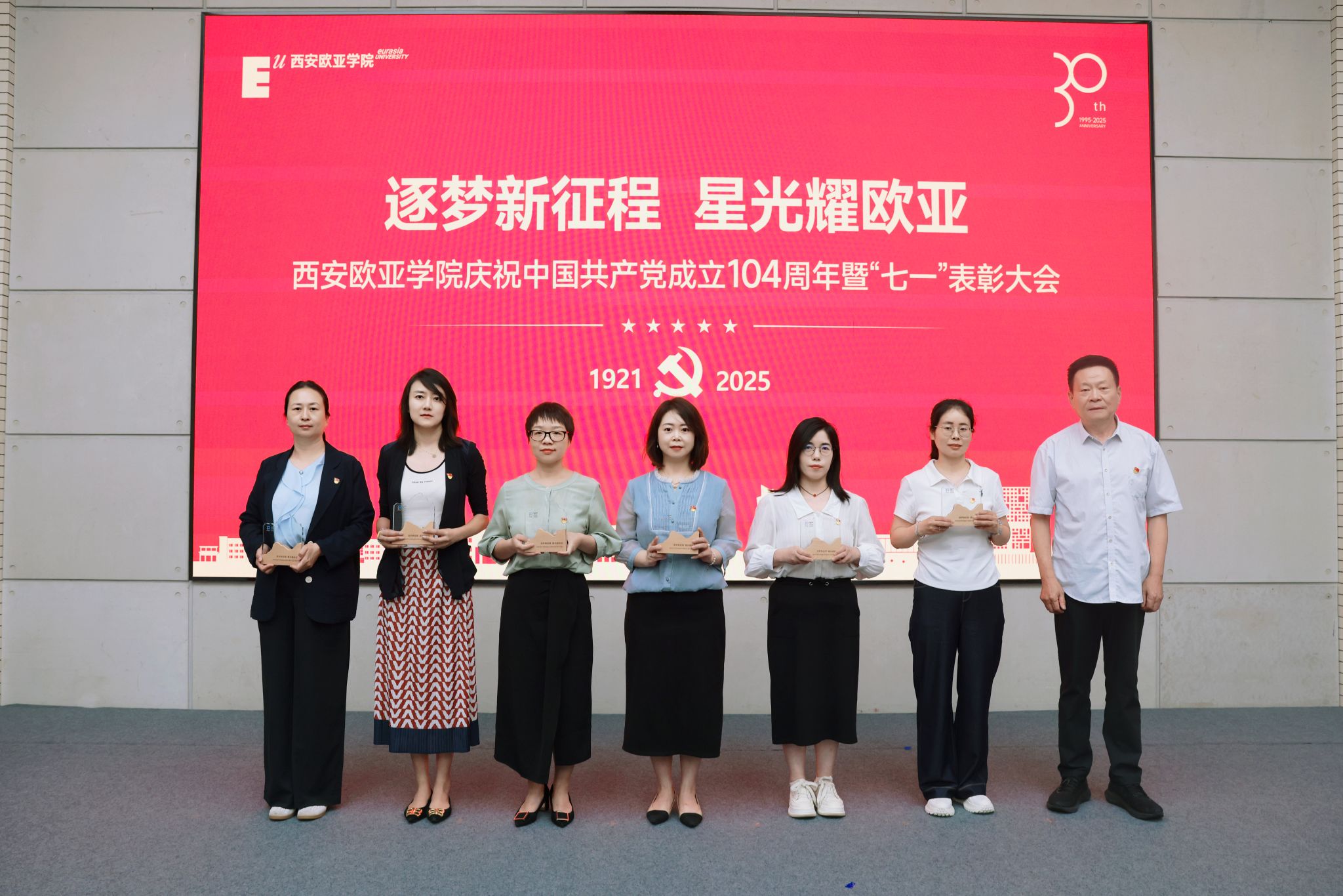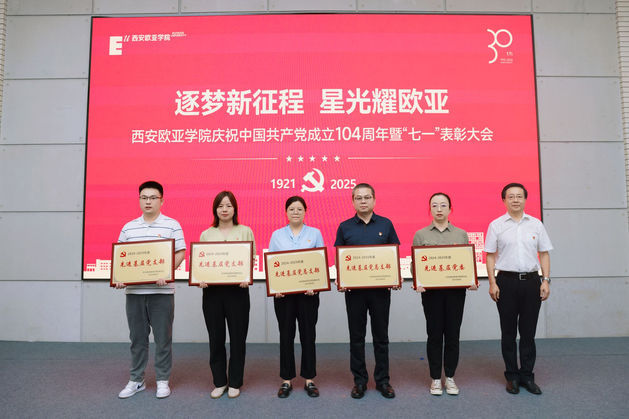 赵国华在讲话中,向受表彰的集体与个人致以祝贺,回顾党的奋斗历程与学校党建成果,并从五个方面部署工作。他强调,立足新时代,奋进新征程,以党建为引领,让旗帜更红、根基更牢:一要把党建优势转化为发展优势,让活力变动能、成果促效能,以高质量党建赋能高质量发展;二要弘扬伟大建党精神,让堡垒更坚固、先锋更闪耀,让红色基因在育人中传承、在创新中生辉;三要强化头雁领航与榜样带动,让“双带头人”显担当、获奖者作示范,以典型力量聚奋进合力;四要放大党建品牌辐射效应,让标杆立得稳、特色亮得出,推动党的建设从“标杆引领”到“全面提质”;五要以党建“强引擎”驱动学校向中国一流国际化应用型本科高校加速迈进,在教育强国强省建设中,写就“党建红引领教育兴,欧亚人建功新时代”的崭新篇章。