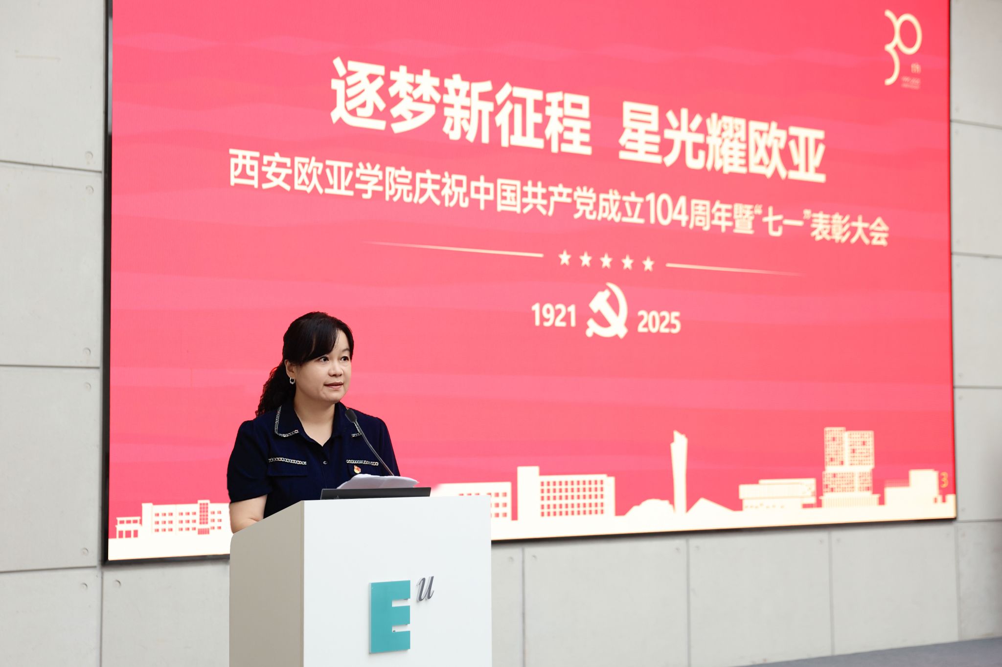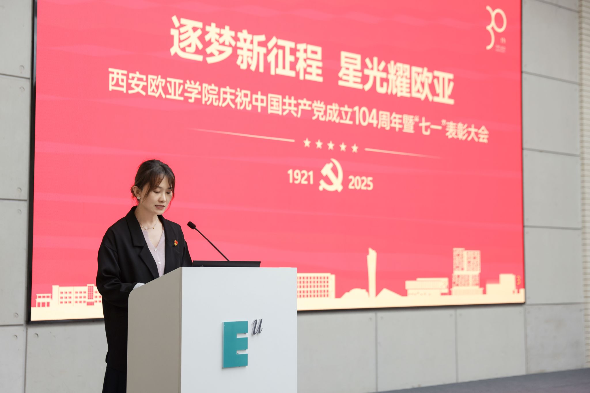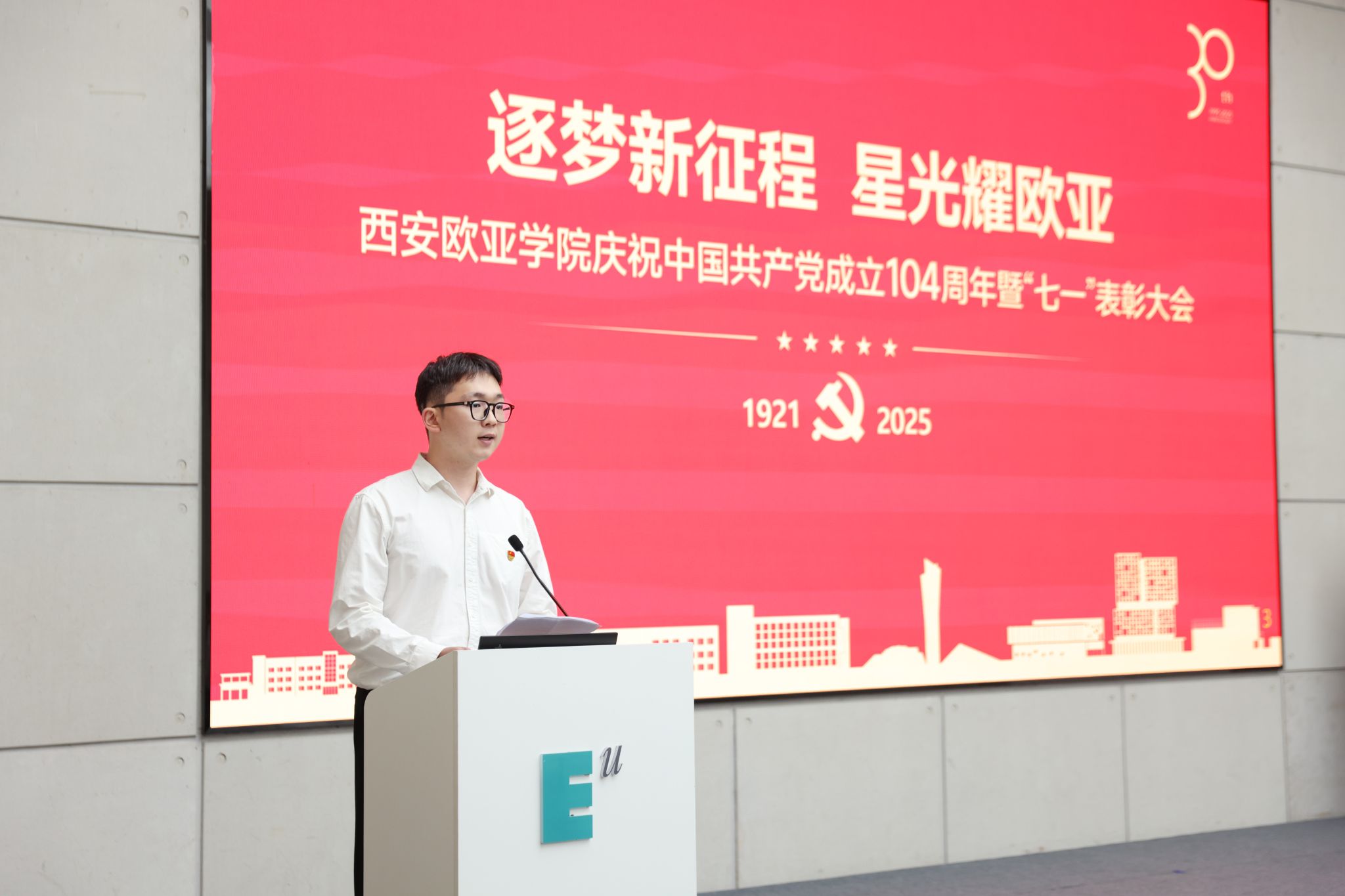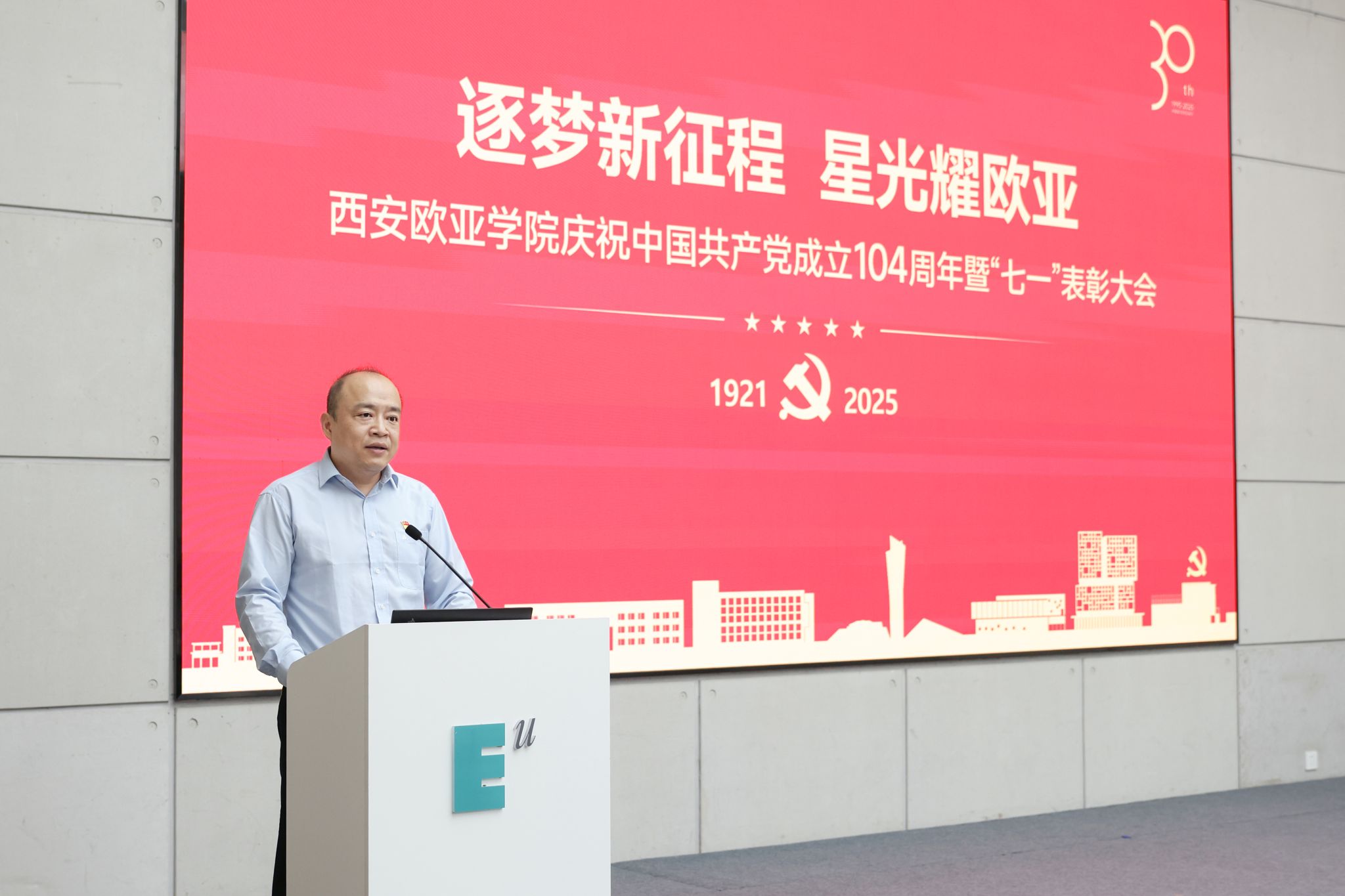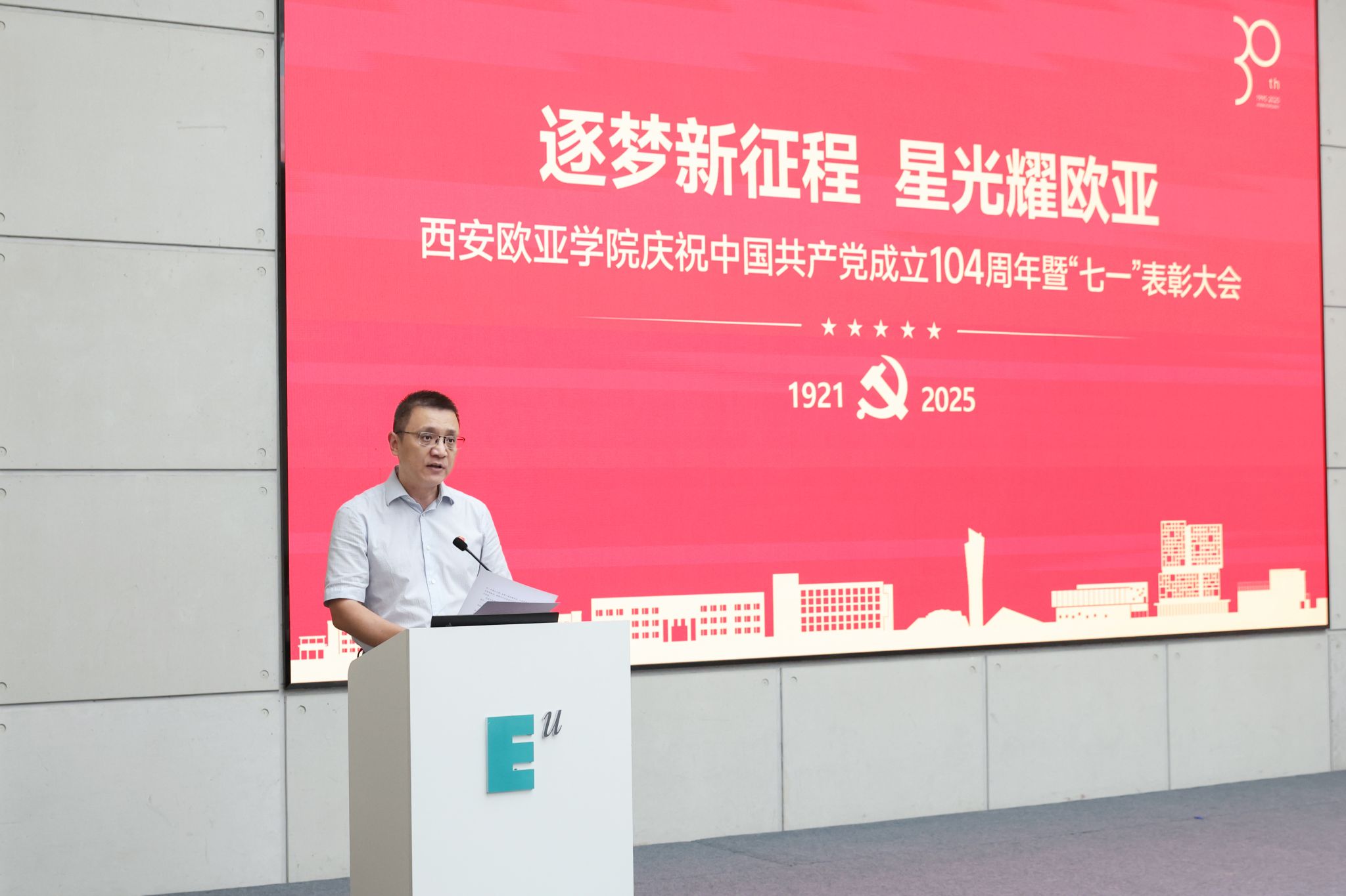赵国华在讲话中,向受表彰的集体与个人致以祝贺,回顾党的奋斗历程与学校党建成果,并从五个方面部署工作。他强调,立足新时代,奋进新征程,以党建为引领,让旗帜更红、根基更牢:一要把党建优势转化为发展优势,让活力变动能、成果促效能,以高质量党建赋能高质量发展;二要弘扬伟大建党精神,让堡垒更坚固、先锋更闪耀,让红色基因在育人中传承、在创新中生辉;三要强化头雁领航与榜样带动,让“双带头人”显担当、获奖者作示范,以典型力量聚奋进合力;四要放大党建品牌辐射效应,让标杆立得稳、特色亮得出,推动党的建设从“标杆引领”到“全面提质”;五要以党建“强引擎”驱动学校向中国一流国际化应用型本科高校加速迈进,在教育强国强省建设中,写就“党建红引领教育兴,欧亚人建功新时代”的崭新篇章。