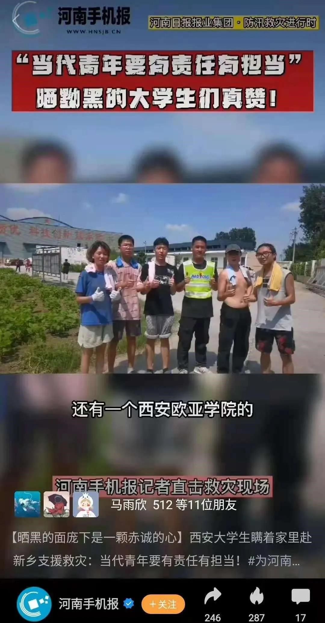 7月23日,鸭脖第二青年社区分党委学生入党积极分子鲁亮亮(人居环境学院智能建造专业2001班)和Xdea青年社区入党积极分子学生梁鑫驰(信息工程学院软件工程专业2003班)与其三位好友,志愿报名加入陕西曙光救援队参与救援工作,于当日凌晨3点抵达河南省新乡市,与河南、山东、四川等各地志愿者会合,投入紧张的救援工作:劳动桥堤口填装、搬运沙袋,快速卸载救援物资、救援当地居民等;并在新乡灾情缓和后于24日至河南卫辉进行持续救援工作。对他们而言,一天两三个小时的睡觉、水电的资源都极为奢侈;同时在与各地志愿者的合力救援中,也感受到了我国人民的凝聚力。