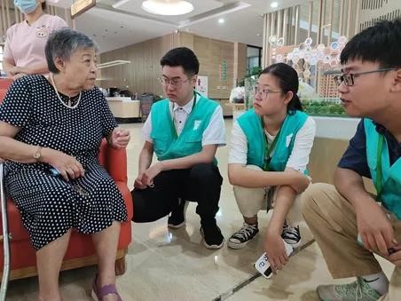 诗朗诵结束后,实践队同学们俯身蹲在老人们的身旁,倾听他们讲述革命故事,站在老一辈人的角度感受不一样的爱党爱国热情。时代在不停向前,故事在不断积累,老人们带给同学们的不仅是他们曾经生活的点滴记忆,更是烙印在他们身上的时代印记。实践队的同学们在了解和关怀老人们日常生活的同时,也为老人们带去了独属于青葱少年的那份温情的陪伴。