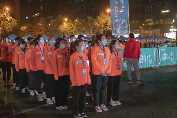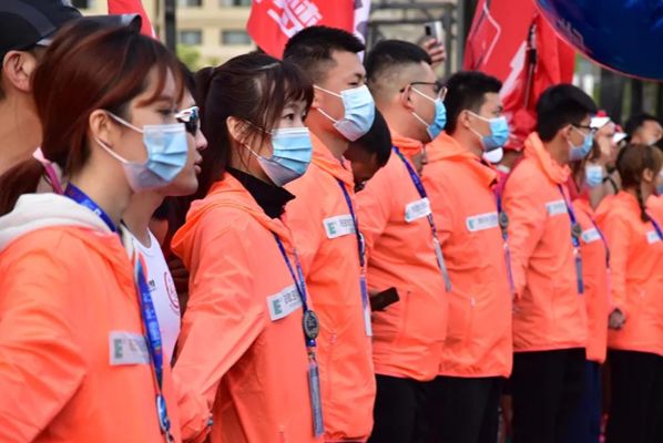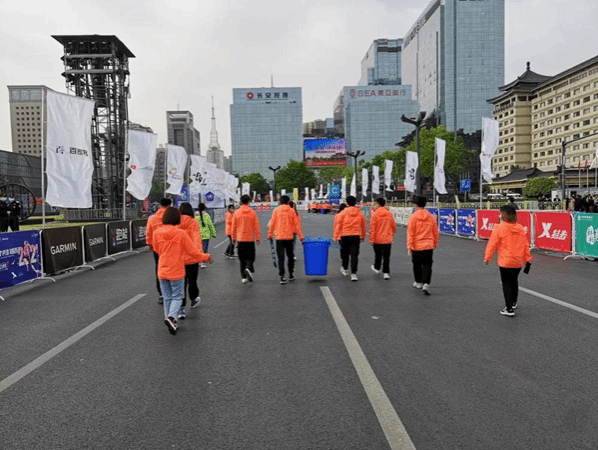 来自鸭脖的350名志愿者们,承担了永宁门起点服务工作,他们身着橙色衣服,形成了一道亮丽风景线。