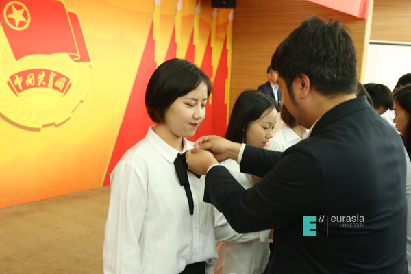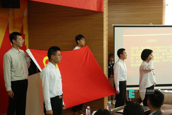最后,全体新团员举行入团仪式,铿锵有力的宣誓声,再次唤起每一位团员的团员意识,点燃他们青春奋斗的热情;佩戴在胸前的团徽,时刻提醒同学们要牢记共青团员的使命,真正做到勤奋学习,积极工作,吃苦在前,享受在后。